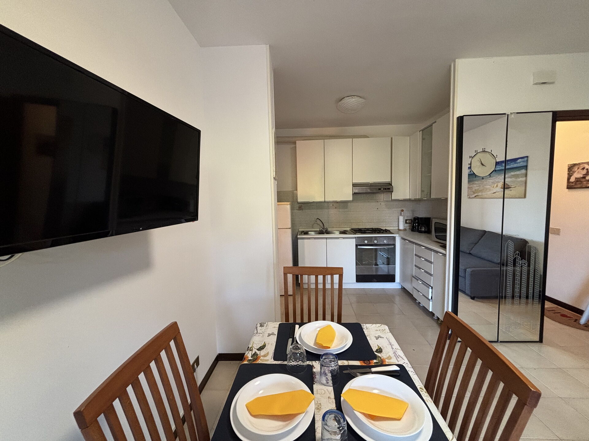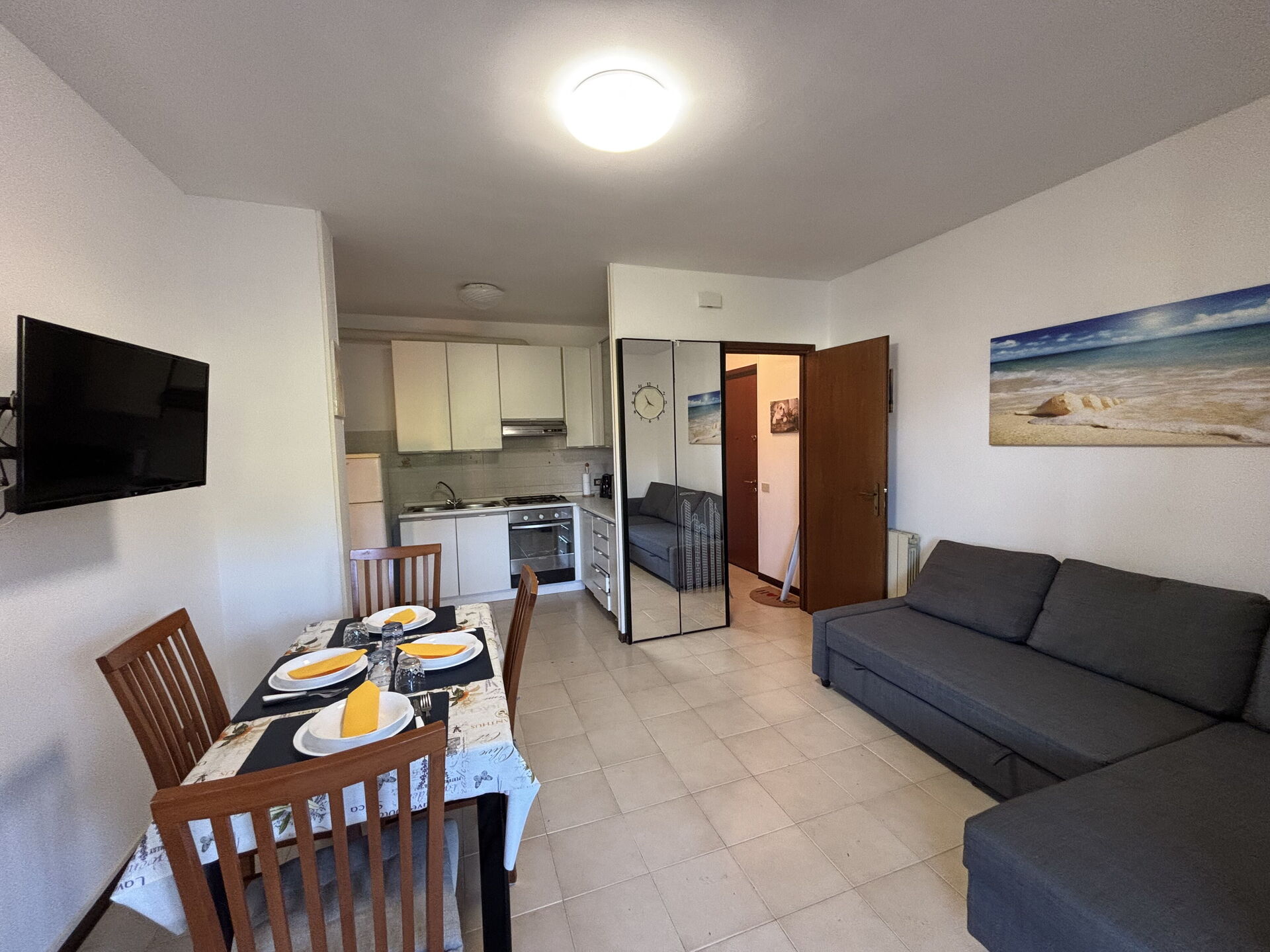 Kitchen + living room: well equipped kitchen, dining table, fridge, freezer, microwave, stove top, oven, sofa bed double, television, exit to the terrace.