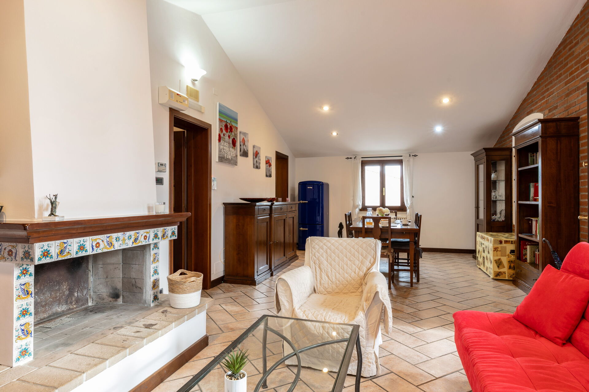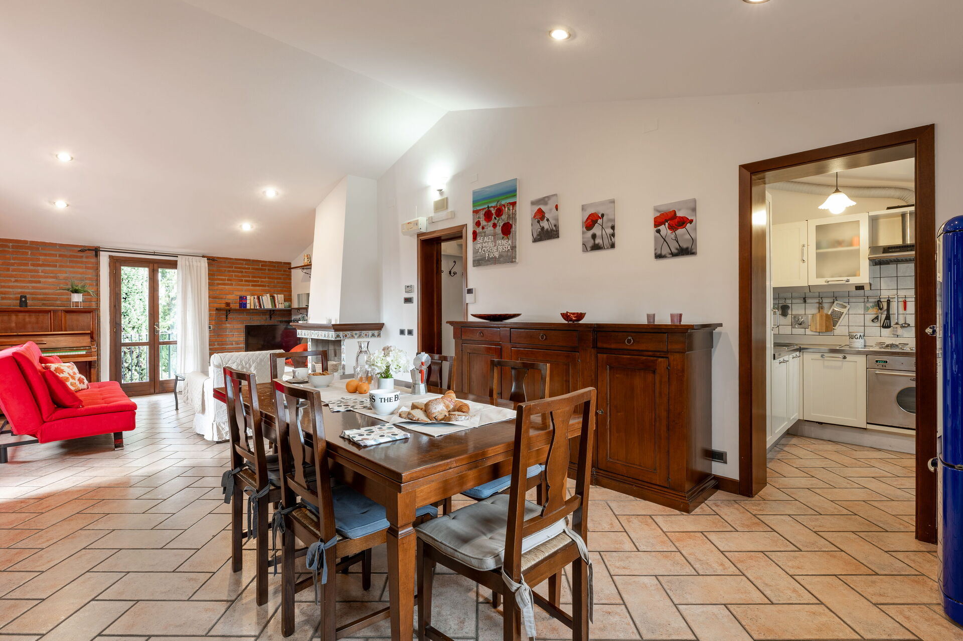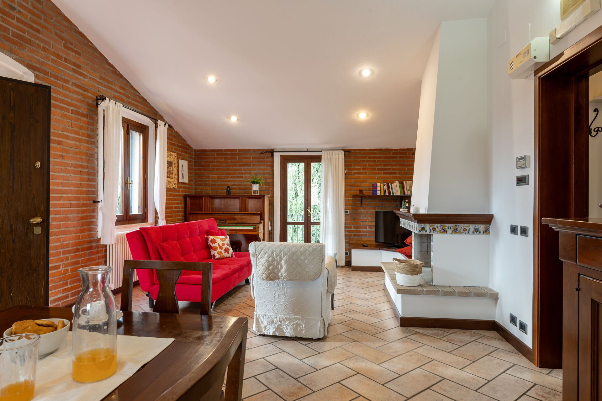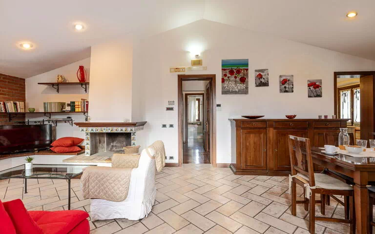 Living room: working desk, fireplace, dining table, sofa bed double, WIFI internet, satellite tv, exit to the balcony.