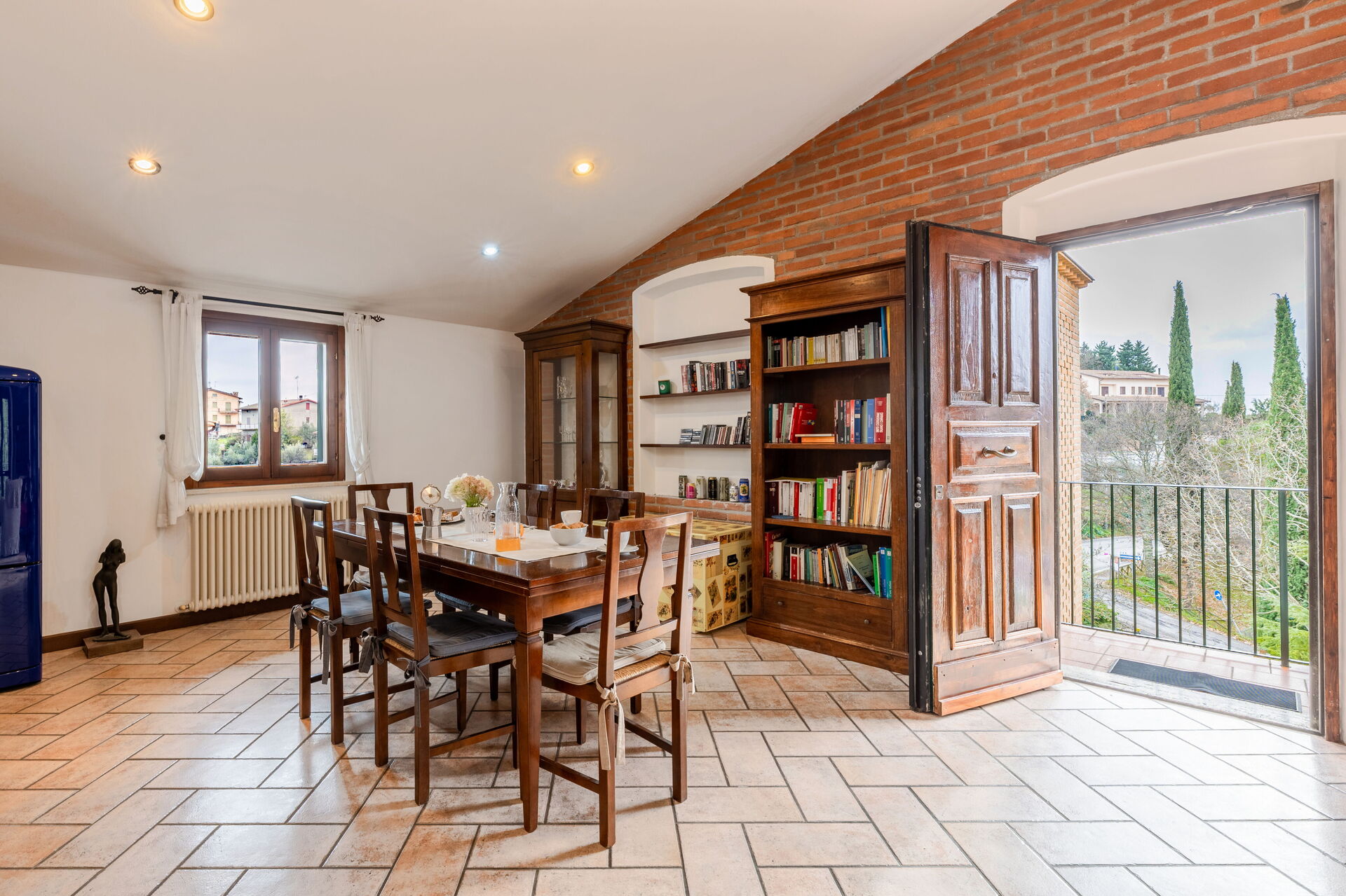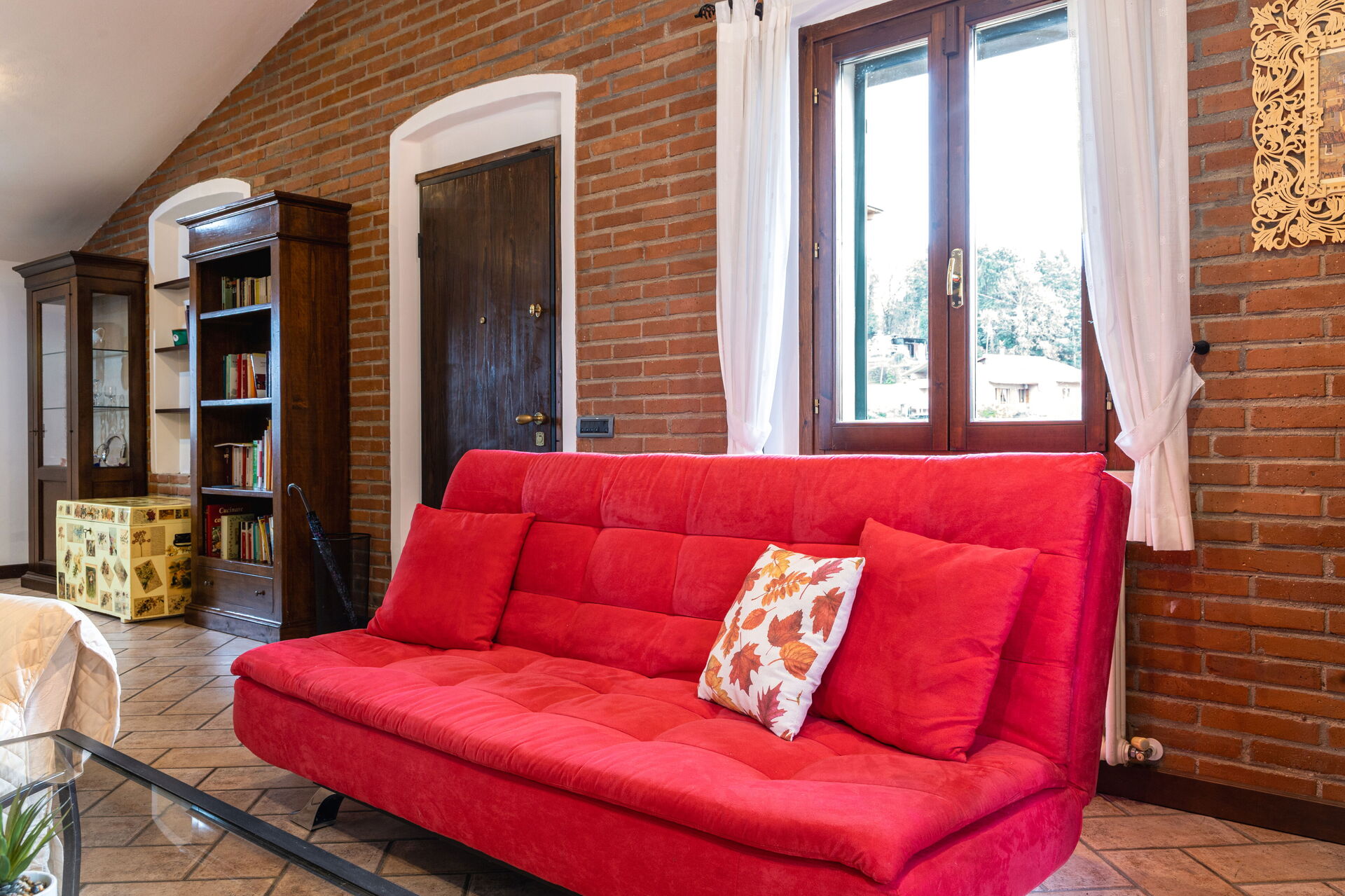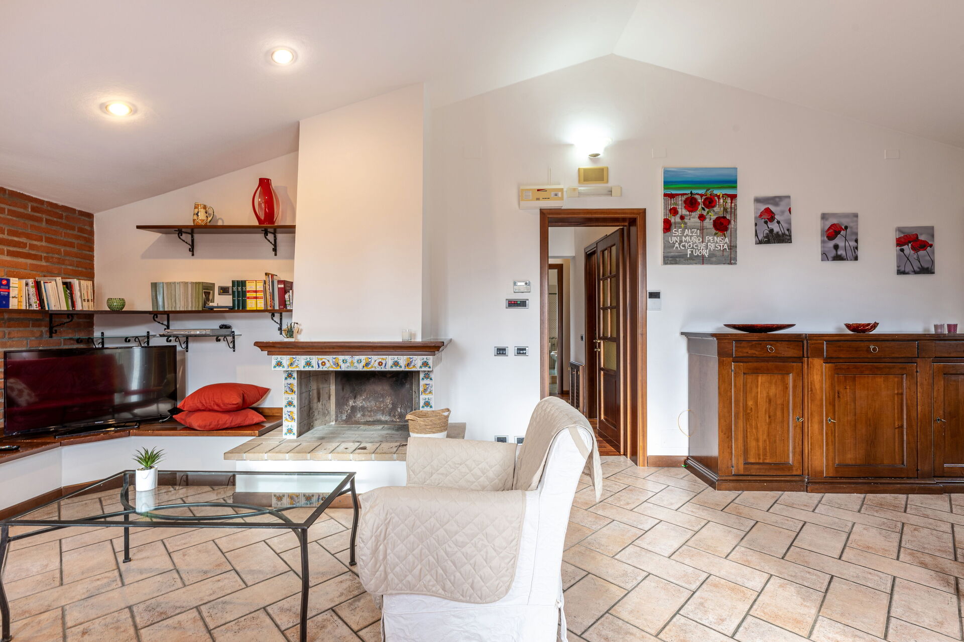 Living room: working desk, fireplace, dining table, sofa bed double, WIFI internet, satellite tv, exit to the balcony.