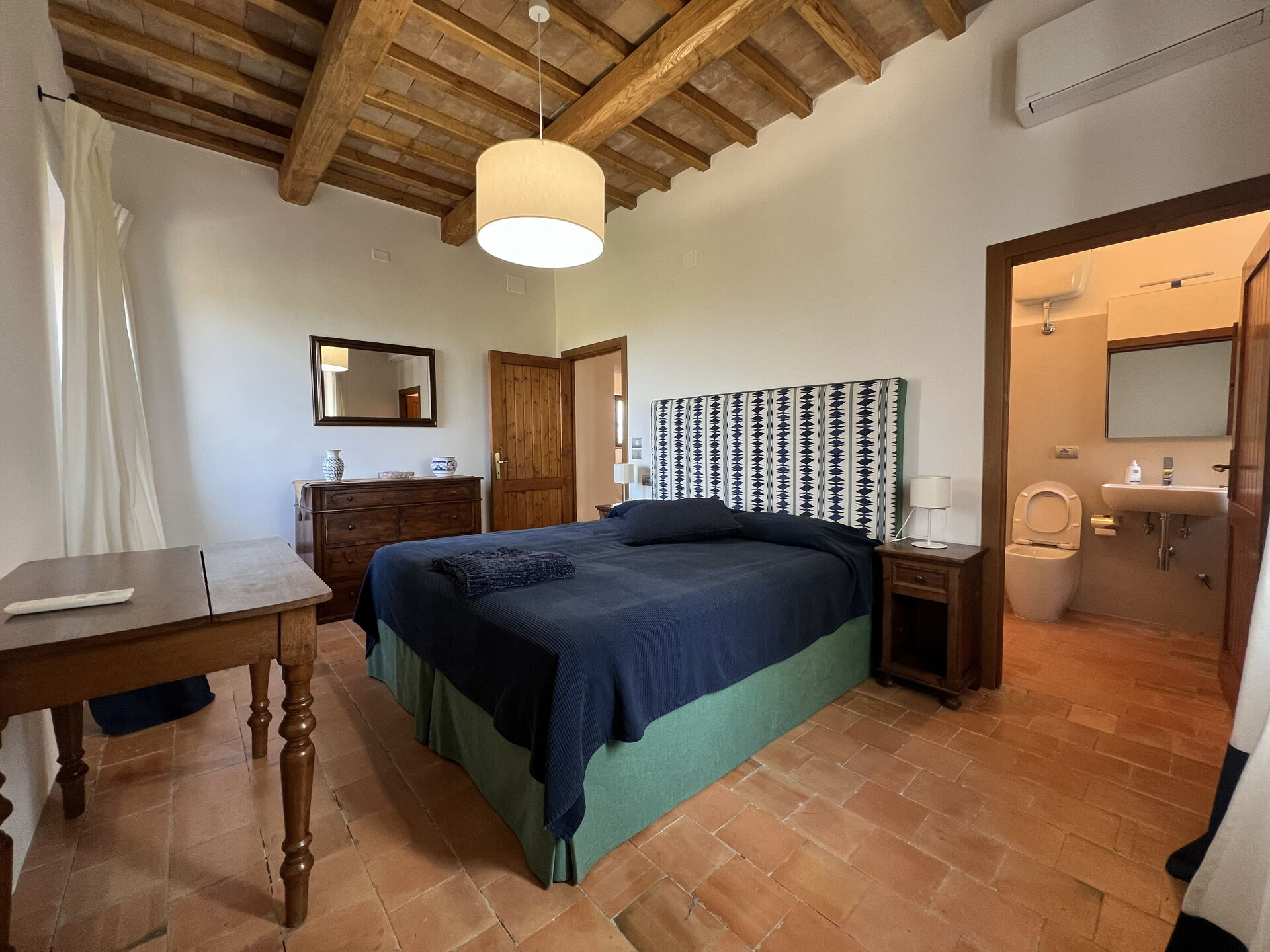 You will find the villa comfortably accommodates up to 11 guests across 6 well-appointed bedrooms, each paired with 6 thoughtfully designed bathrooms. The main level presents a showcase of local artisanship, featuring traditional wood-beamed, vaulted ceilings and terra-cotta-tiled floors throughout. This floor houses 2 bedrooms and 2 bathrooms, along with generous communal spaces. The first bedroom features an iron double bed, a double wardrobe, a chest of drawers, and 2 chairs, offering views over the rolling hills of Orvieto with a private bathroom just outside the room equipped with a stand-alone shower. The second bedroom on this level serves as a cozy guest room furnished with a single bed, a chest of drawers, a chair, and built-in storage, ideal for 1 guest and offering access to the library. The main level also includes a spacious kitchen and dining area, a pantry with laundry facilities, a cozy living room furnished with double sofas and armchairs, a library with a vaulted ceiling and a collection of 500 to 600 books, and a studio space suitable for work or relaxation. The upper floor provides a haven of comfort and privacy, offering luxurious accommodations with breathtaking views of the surrounding hills and vineyards. The first master bedroom is a bright, spacious room with a double bed, chest of drawers, walk-in closet, and a desk, complemented by an en-suite bathroom featuring a tub and a separate shower, while French doors open onto a raised terrace with views of the pool and countryside. The second master bedroom is beautifully appointed with a double bed convertible to twin beds, high ceilings, and vineyard views, along with a well-equipped en-suite bathroom. A fully self-contained private apartment on the upper level offers an ideal arrangement for extended family or friends, featuring 2 bedrooms, each with en-suite bathrooms and flexible bed configurations available as doubles or twins, a fully furnished kitchen, and a private living area.