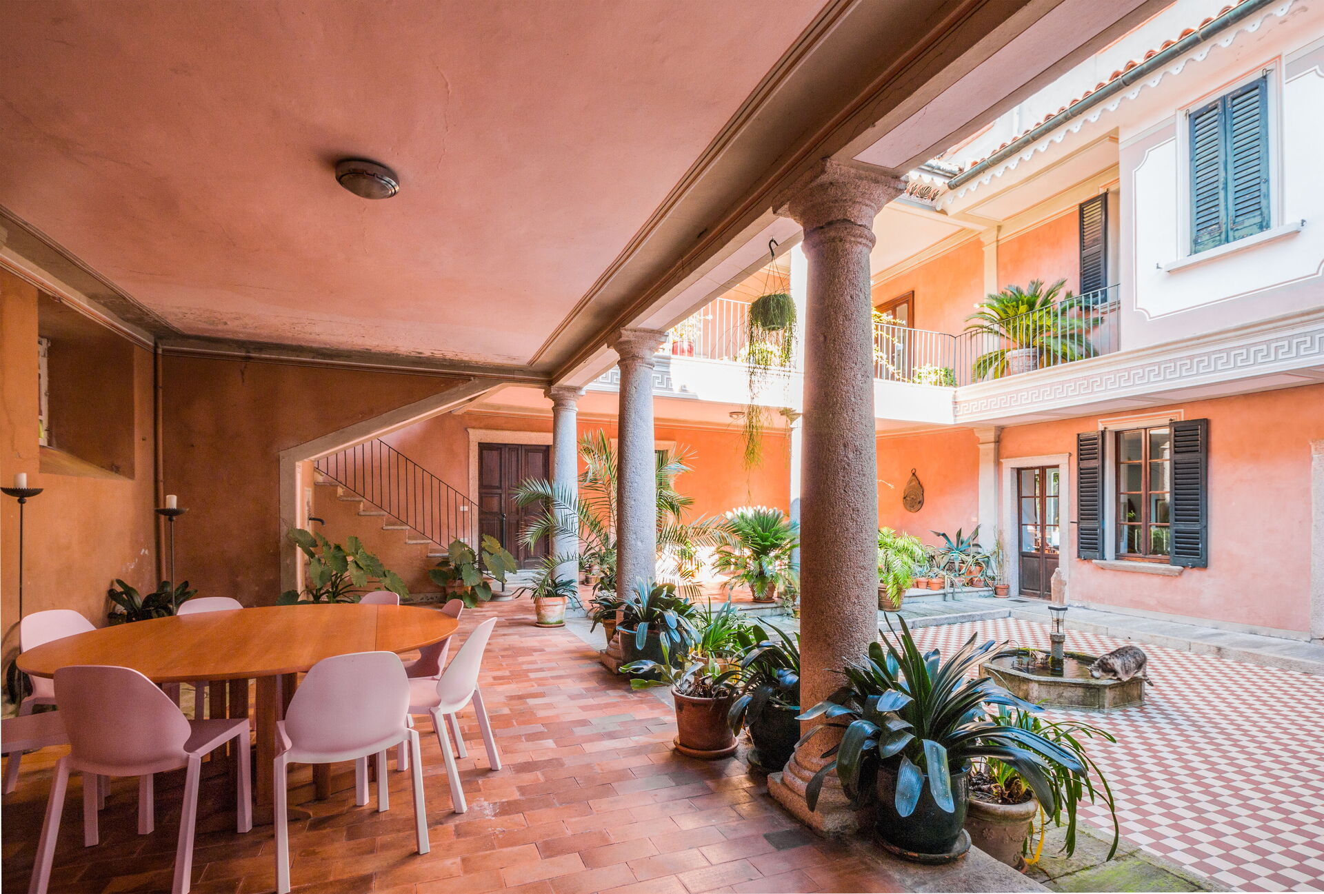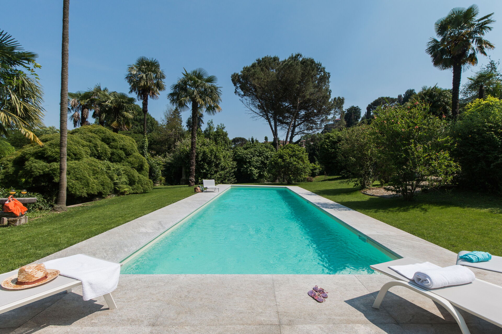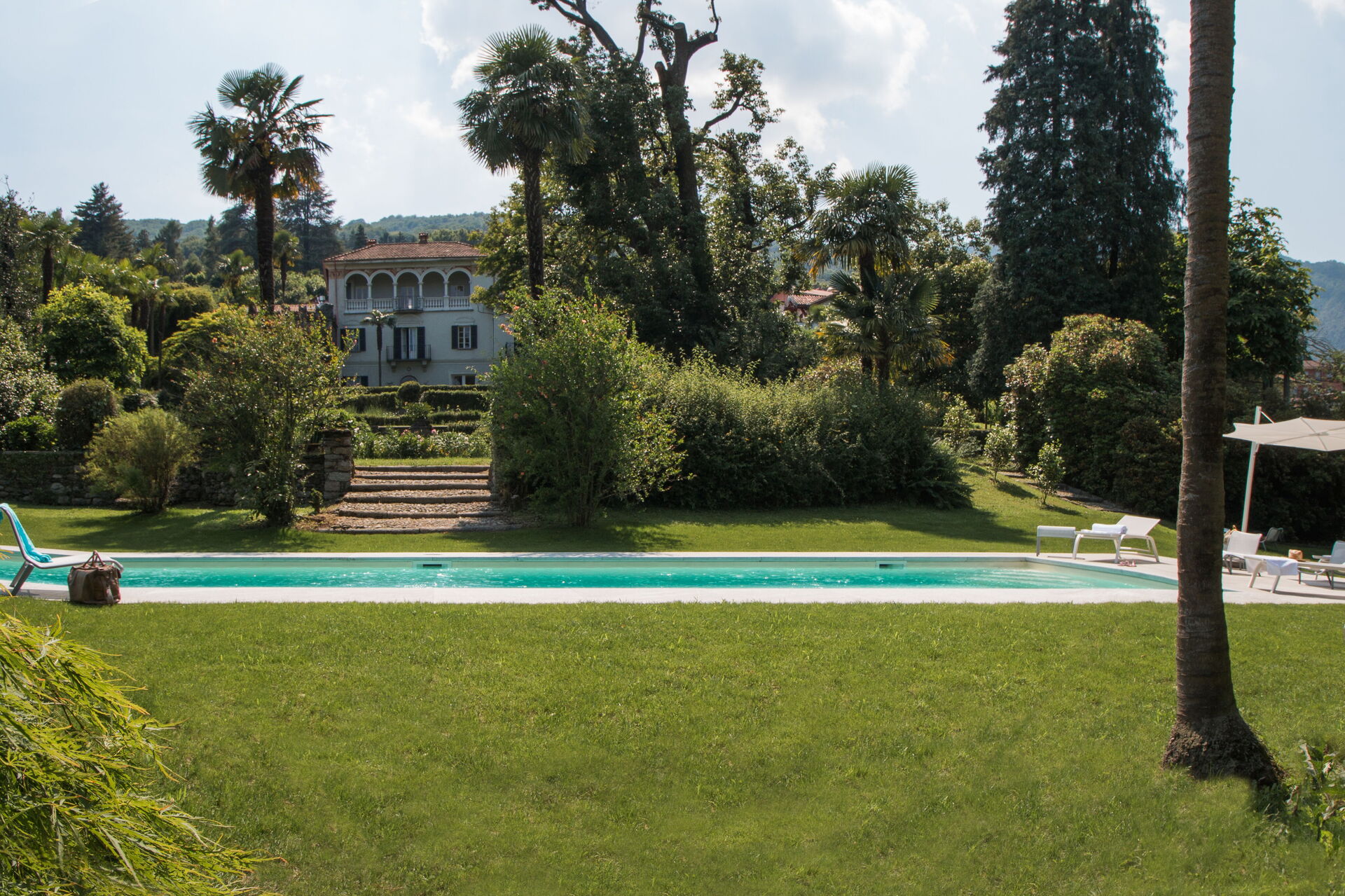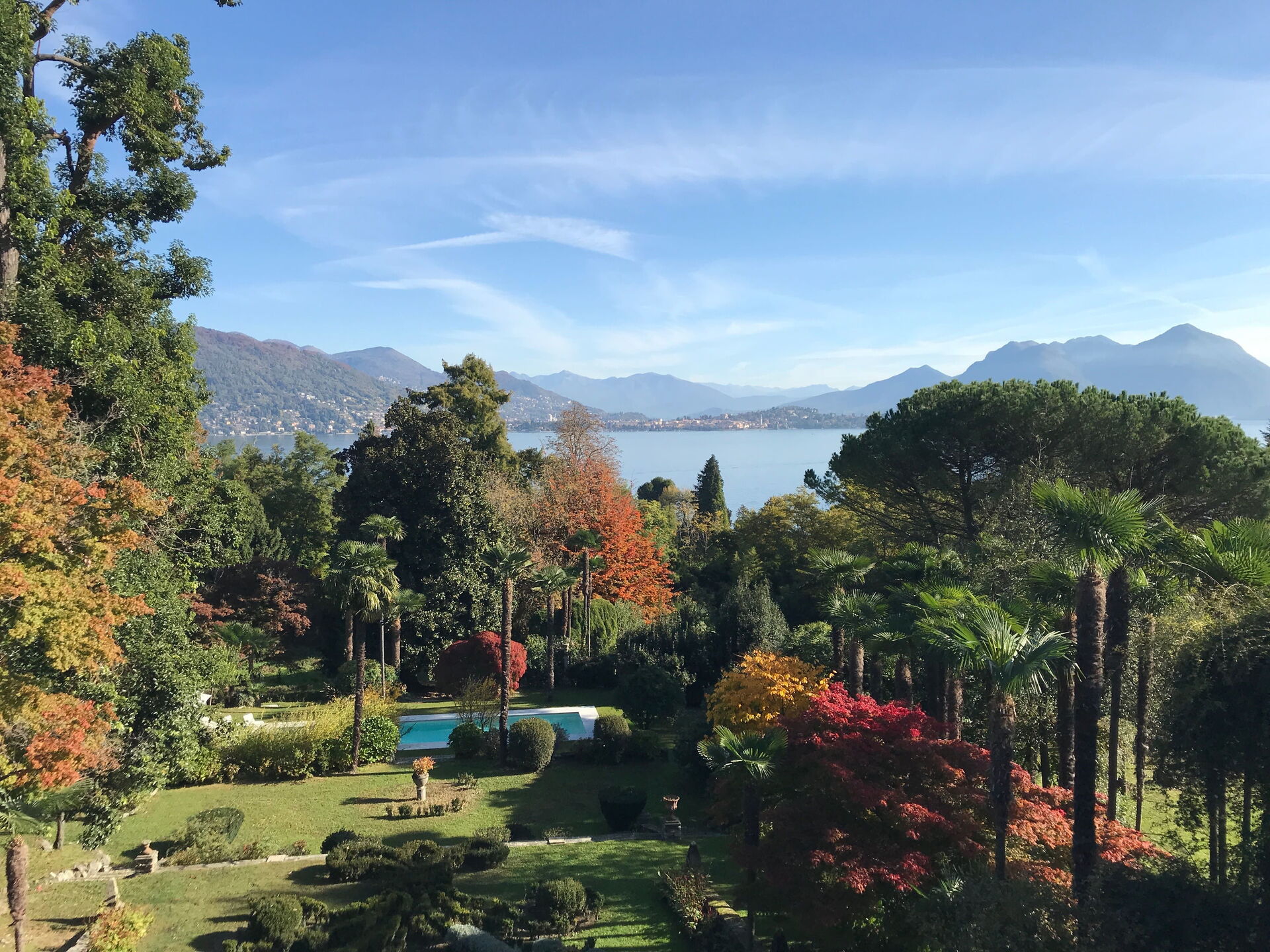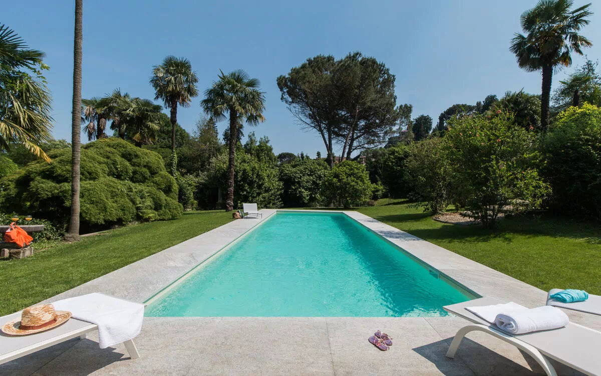 You will stay at Villa Romantica, a beautiful vacation rental located in the lakeshore village of Baveno, Italy, offering splendid views of the famous Lago Maggiore's Borromeo Golf. This historic property was built in the 17th century on an ancient monastery and features a unique 17th-century Andalusian patio. The villa accommodates up to 16 guests across the Main Villa sleeping 12 people and the Guesthouse accommodating 4 people, totaling 760 square meters for the Main Villa and 160 square meters for the 2 dependences. You will enjoy a magnificent terraced garden spanning 1.5 hectares, designed in the twenties by Maurice Blondel, complete with a water garden, rose garden, and arboretum. The property offers a private swimming pool measuring 16 x 4 x 1.40 meters, spacious yard areas, internet wifi coverage throughout the house and courtyard, and private parking facilities. Set just an hour's drive from Milan and within walking distance to shops and the main boulevard along Baveno's lake promenade, this in-town property combines historic charm with modern comfort. All living areas feature spacious rooms with high ceilings and large panoramic windows, furnished with a mix of modern design and antiques that have belonged to the owner's family for hundreds of years. Please note that Villa Romantica is not suitable for people with walking difficulties, and the local train passes 250 meters from the property downhill, separated by other properties, trees, and bushes.