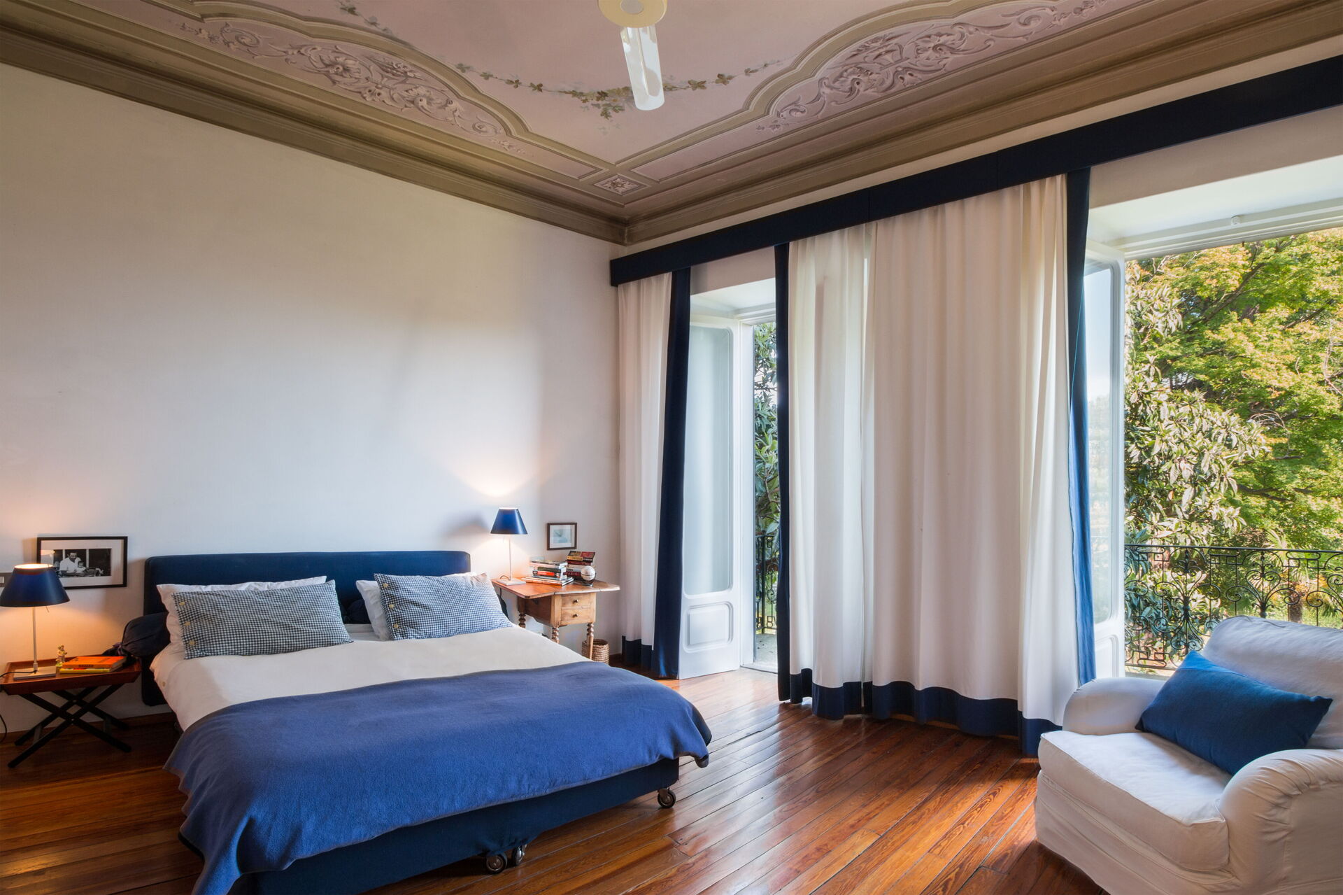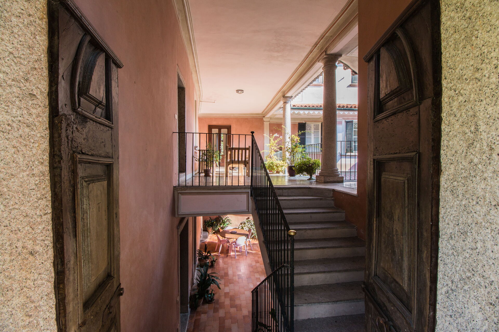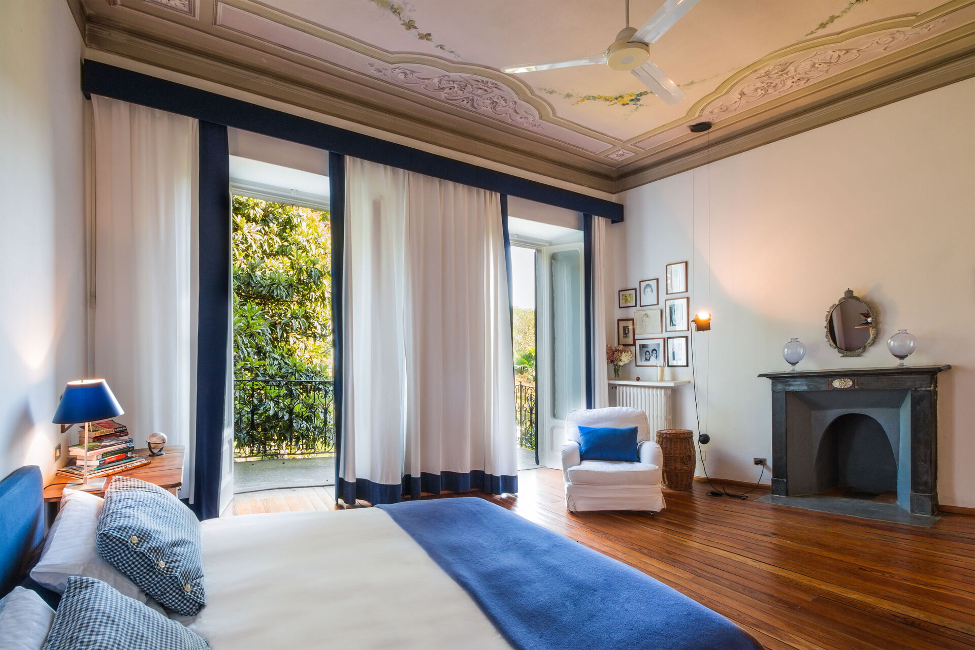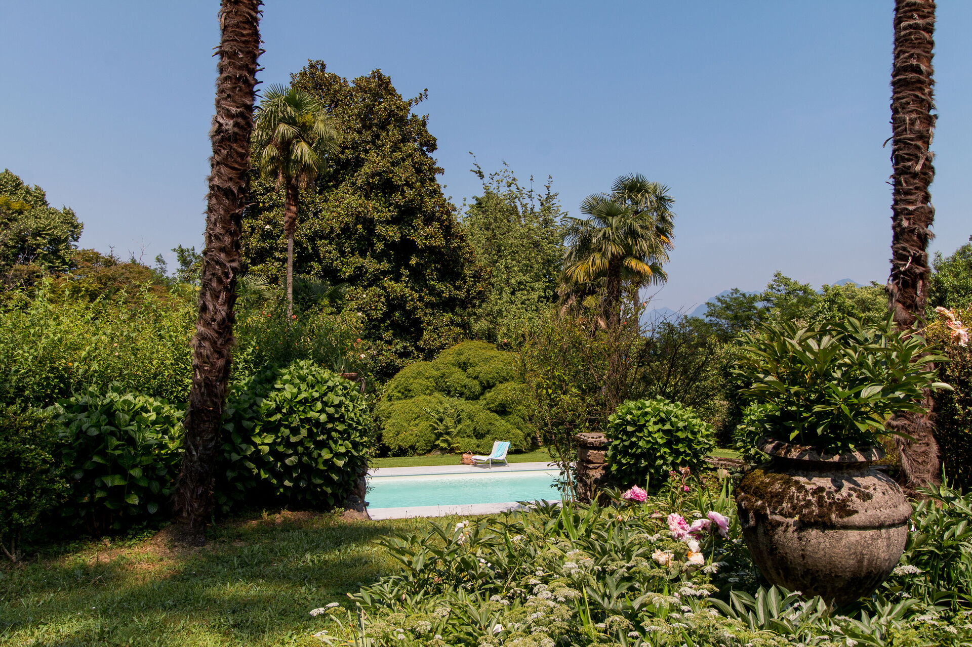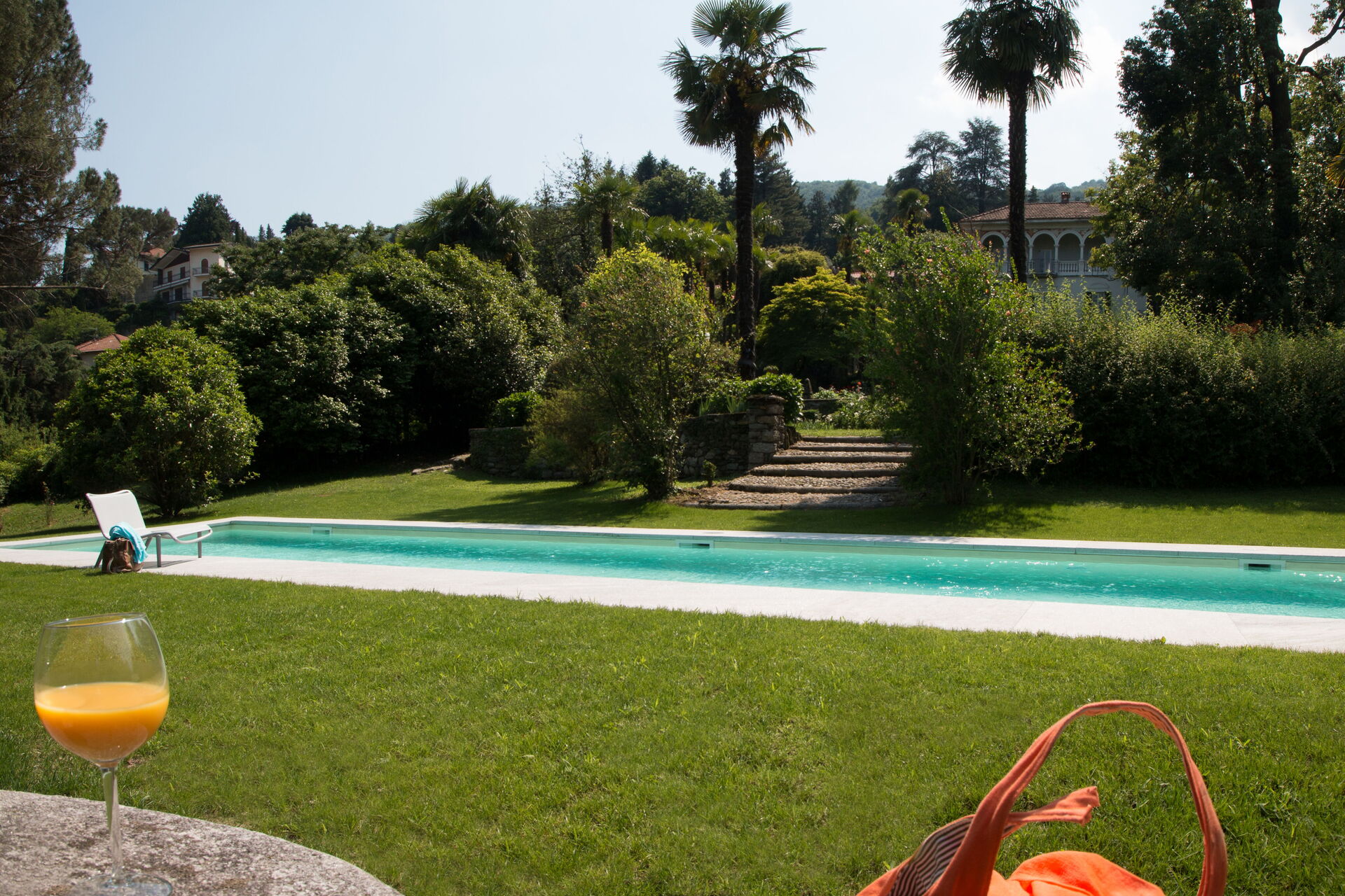 You will stay at Villa Romantica, a beautiful vacation rental located in the lakeshore village of Baveno, Italy, offering splendid views of the famous Lago Maggiore's Borromeo Golf. This historic property was built in the 17th century on an ancient monastery and features a unique 17th-century Andalusian patio. The villa accommodates up to 16 guests across the Main Villa sleeping 12 people and the Guesthouse accommodating 4 people, totaling 760 square meters for the Main Villa and 160 square meters for the 2 dependences. You will enjoy a magnificent terraced garden spanning 1.5 hectares, designed in the twenties by Maurice Blondel, complete with a water garden, rose garden, and arboretum. The property offers a private swimming pool measuring 16 x 4 x 1.40 meters, spacious yard areas, internet wifi coverage throughout the house and courtyard, and private parking facilities. Set just an hour's drive from Milan and within walking distance to shops and the main boulevard along Baveno's lake promenade, this in-town property combines historic charm with modern comfort. All living areas feature spacious rooms with high ceilings and large panoramic windows, furnished with a mix of modern design and antiques that have belonged to the owner's family for hundreds of years. Please note that Villa Romantica is not suitable for people with walking difficulties, and the local train passes 250 meters from the property downhill, separated by other properties, trees, and bushes.