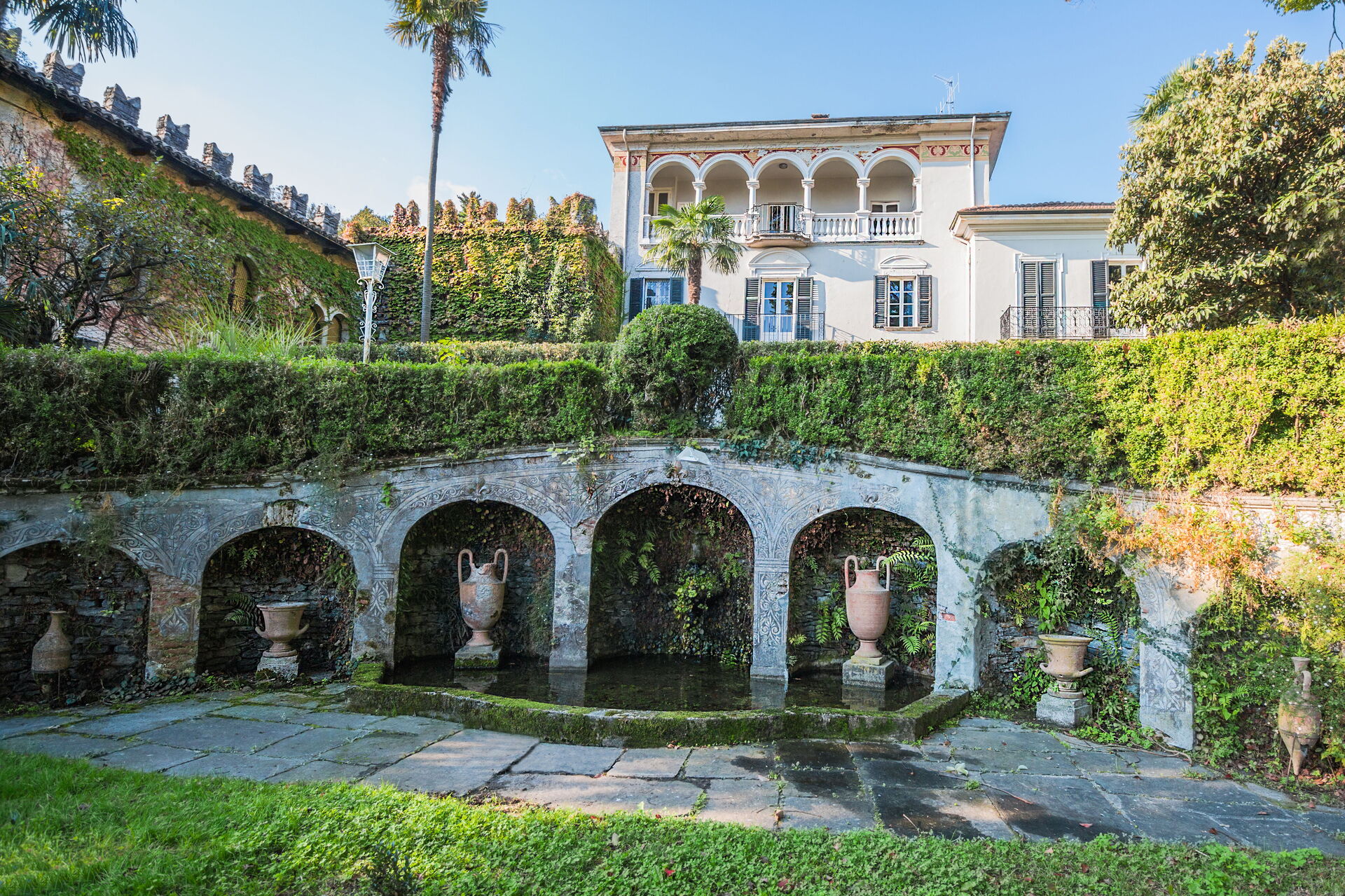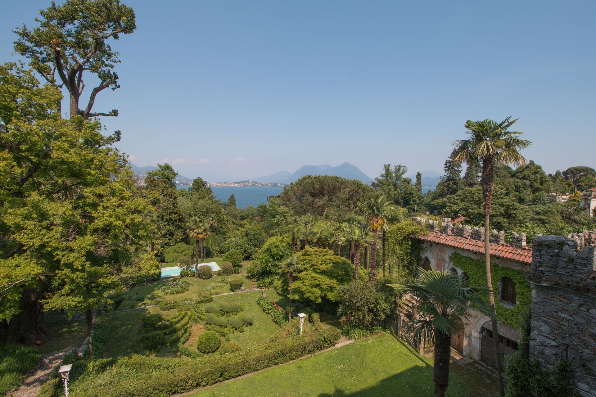 You will discover the magnificent terraced garden that surrounds the property, offering distinct outdoor spaces and breathtaking views. Descending the garden path, you will reach the swimming pool, which is not fenced and features an external shower nearby for your convenience. The extensive outdoor areas include a beautiful water garden, a fragrant rose garden, and an impressive arboretum showcasing diverse plant species. The garden design, created by Maurice Blondel in the twenties, provides multiple terraced levels for relaxation and exploration across its 1.5-hectare expanse. You will find ample outdoor space with 2 garden areas of 200 square meters each associated with the ground floor dependence and first floor apartment. The historic Andalusian patio dating back to the 17th century offers a unique outdoor architectural feature where you can gather and enjoy the Mediterranean-inspired atmosphere. Throughout the outdoor spaces, you will appreciate the combination of historic garden design and natural beauty while taking in the splendid views of Lago Maggiore's Borromeo Golf.