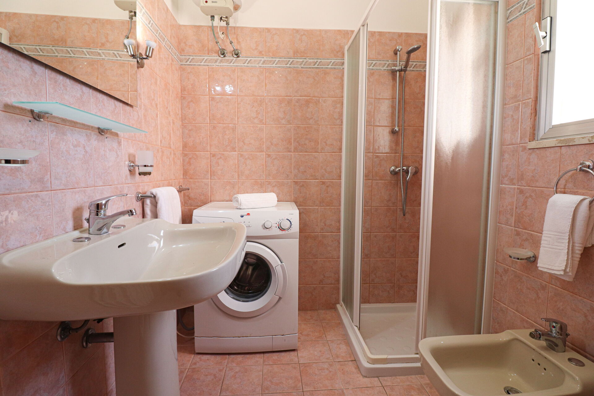 Bathroom 1: basin, toilet, bidet, shower, hairdryer, washing machine.