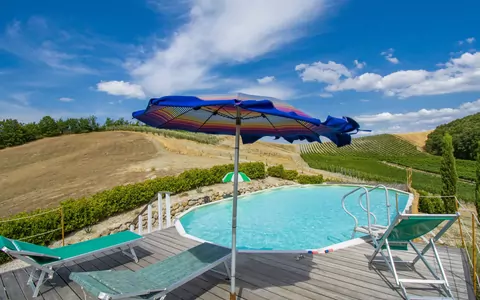 You seek solace in the Tuscan countryside with Il Vallone, a renovated farmhouse nestled within a 16-hectare country estate. Encompassed by vineyards, olive groves, and meadows, this secluded vacation rental offers a serene retreat. Enjoy the amenities of a swimming pool, yard, internet wifi, and parking, allowing you to fully immerse yourself in the tranquil surroundings.