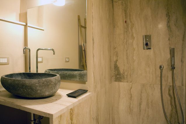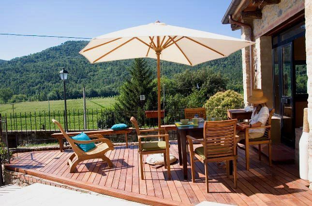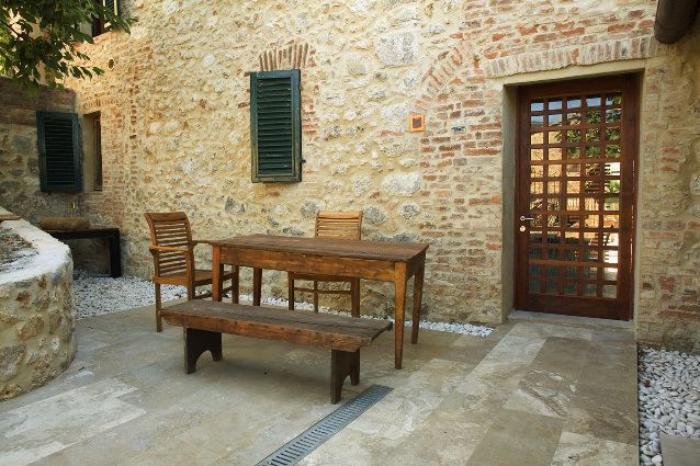 The outdoor space is a stone patio, with relax chairs, teak dining tables and benches, stone carved washing basin. The pizzeria with wood oven is just a behind the corner.