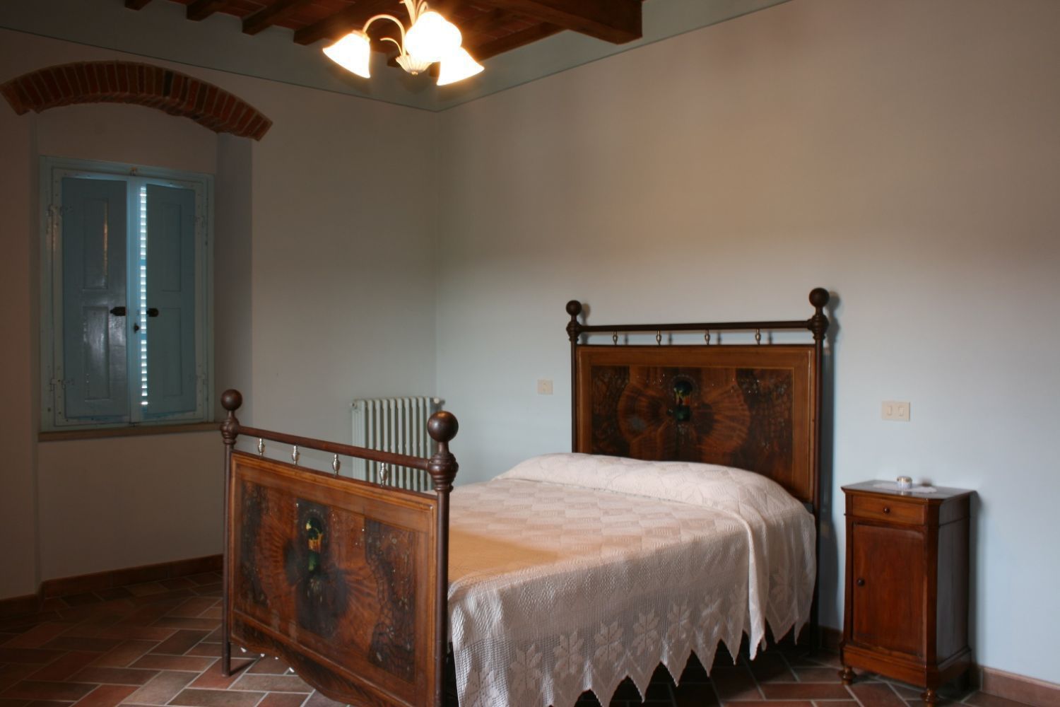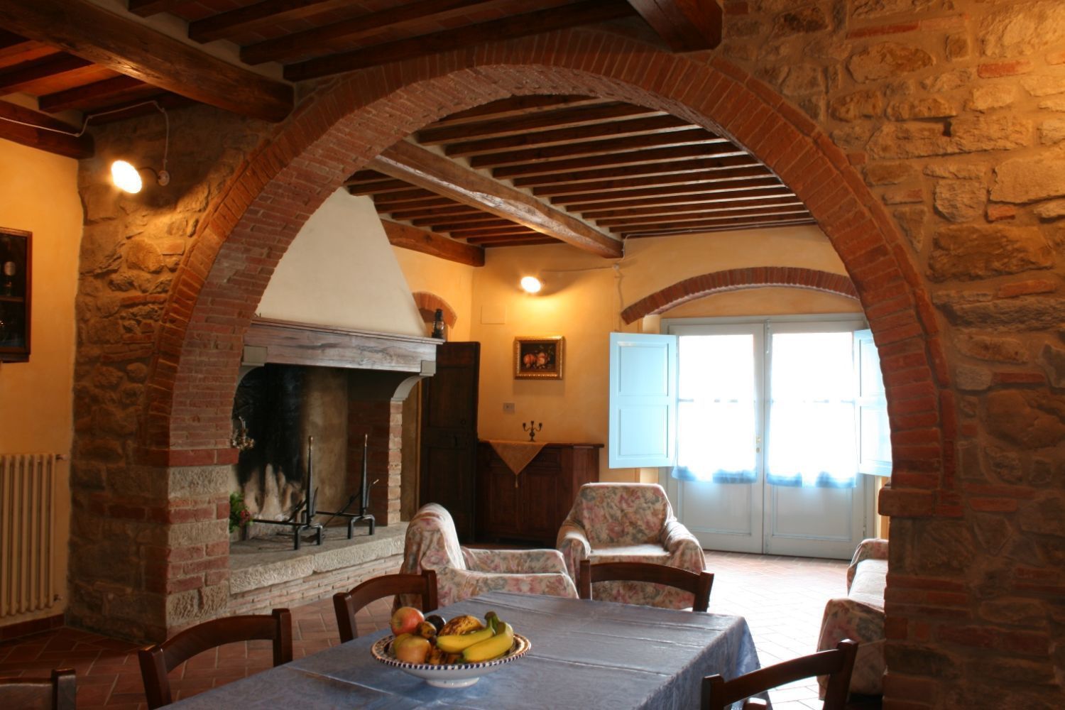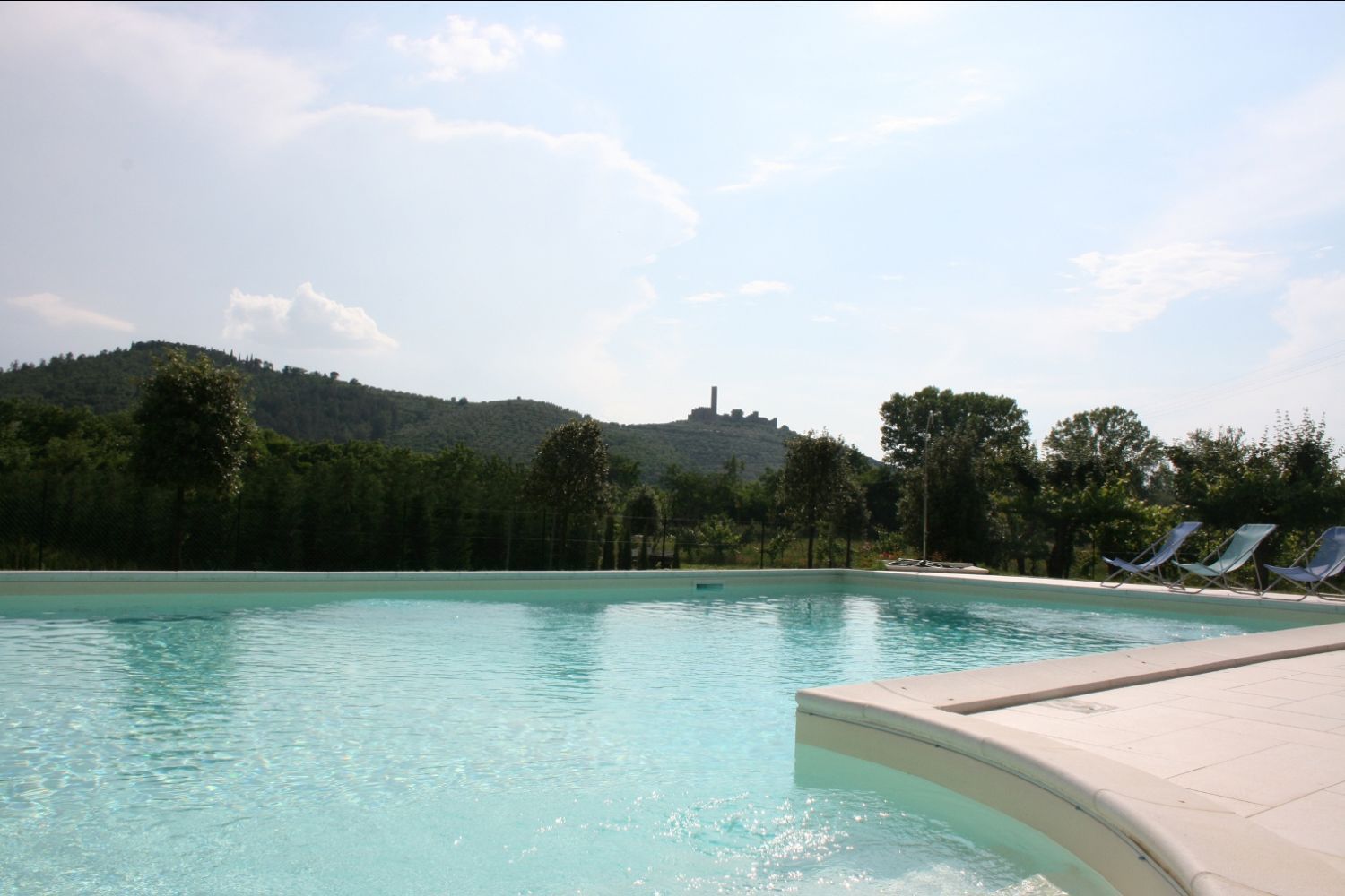 The area around Castiglion Fiorentino includes all the characteristics of the typical Tuscan landscapes. The countryside down in the valley, with endless stretches of nurseries with house plants, fruit and vegetables and flowers alternating with cultivated fields of wheat, corn and sunflowers, merges harmoniously with the high hills where villas and old farmhouses stand surrounded by vineyards and olive groves. Higher up where it is more difficult to cultivate the land, the hills are covered in cool oaks, chestnuts and fir woods. The Agriturismo Scacciapensieri is only a part of an old farmhouse, which thanks to a careful renovation has been given new life and awaits those who wish to spend their holidays in this area. Near the house there is a large garden with a gazebo equipped for eating outside, a barbecue and a beautiful swimming pool (6x12m. - depth 1.40 - 2.20m) exclusively for guests' use, from which one can admire the view of the ancient Castle of Montecchio. Bicycles, satellite TV and DVD player are available for guests' use.It has been well furnished and the internal use of materials is typical of old Tuscan farmhouses. On guests' request the owner can prepare typical Tuscan lunches and dinners.