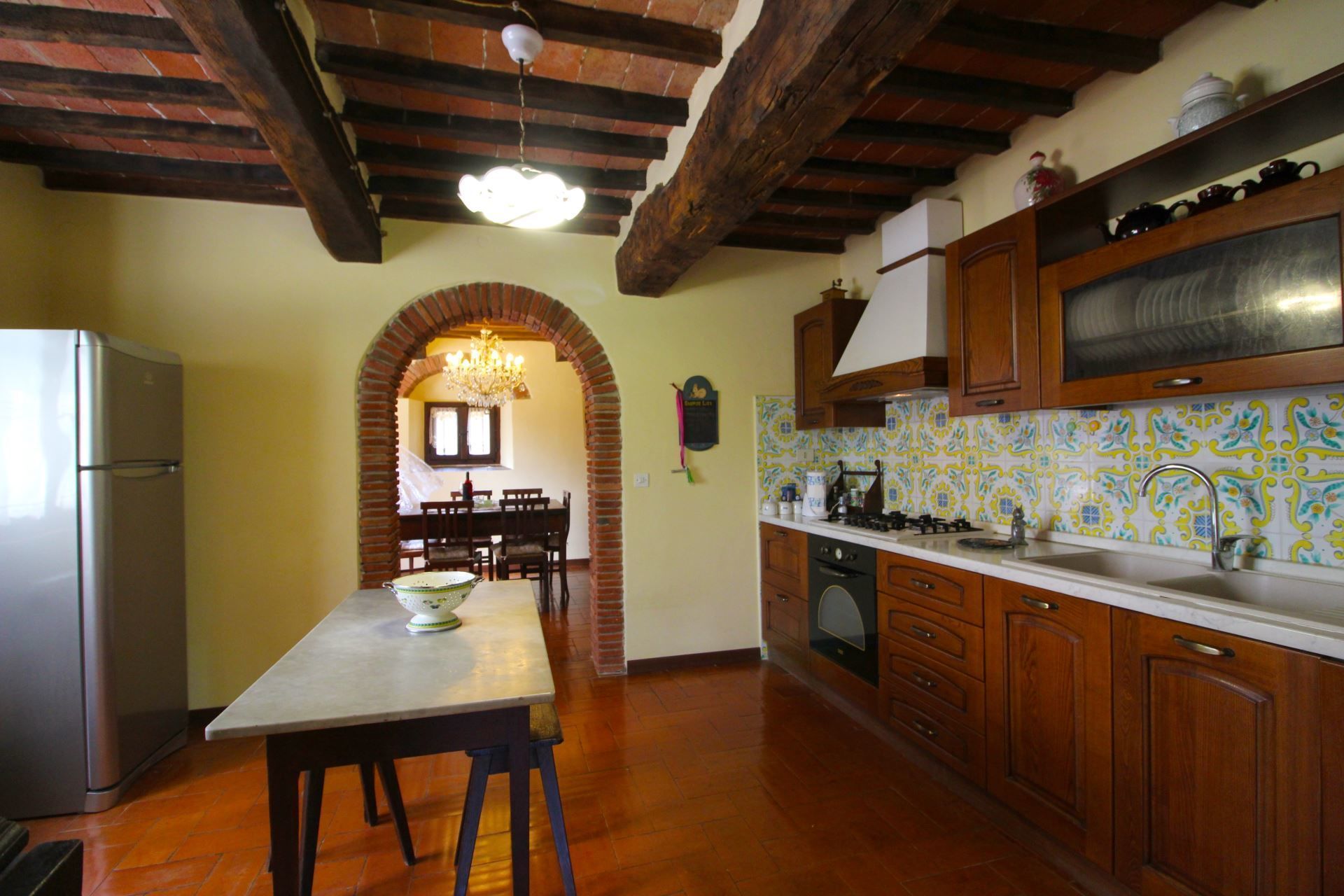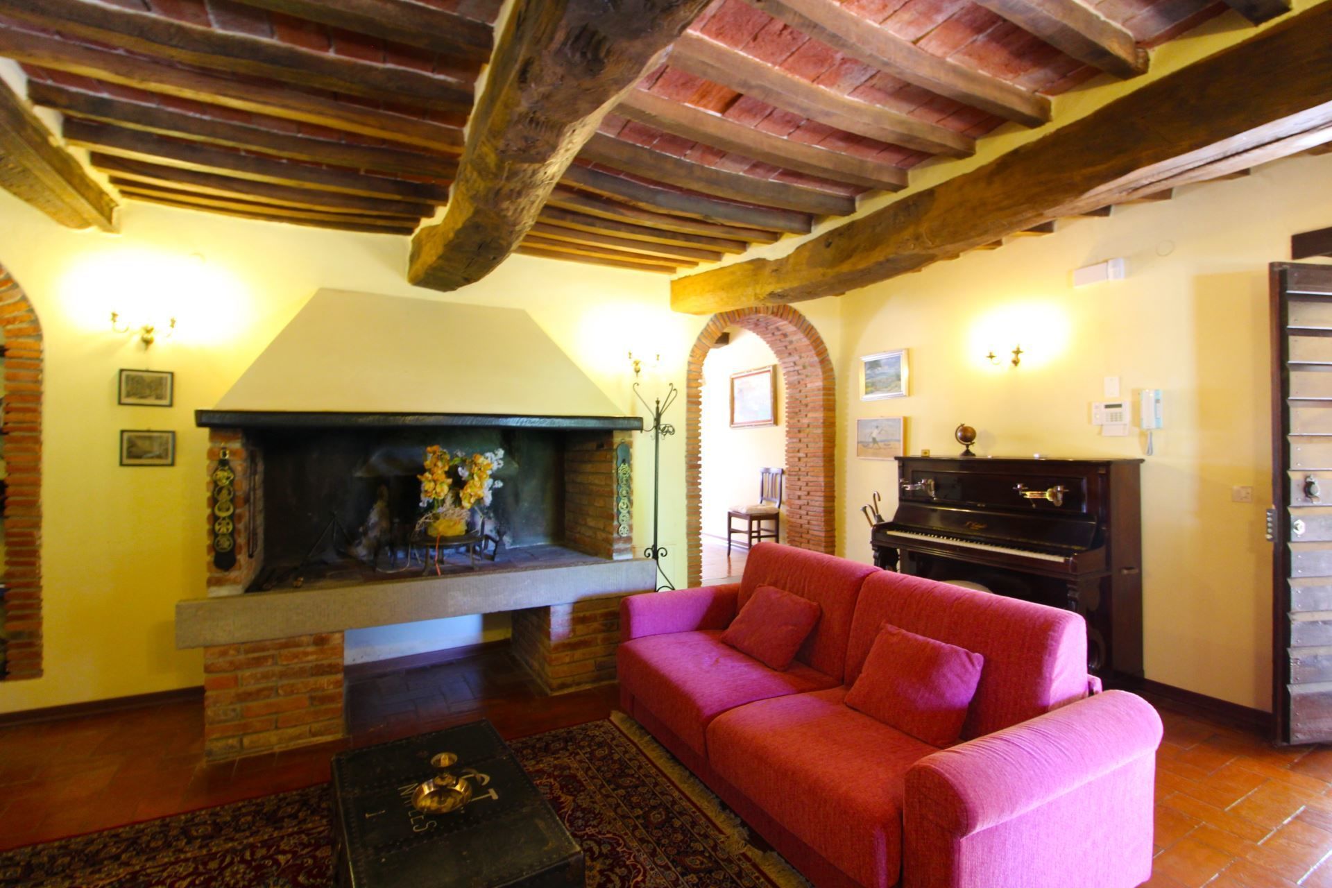 GROUND FLOOR: sitting room with large fireplace, double sofa bed and piano, small bathroom with washbasin and toilette, going up a step access to the living-dining room, connecting arch in brick to the kitchen, facing the porch equipped with table and chairs.