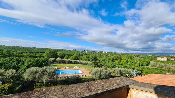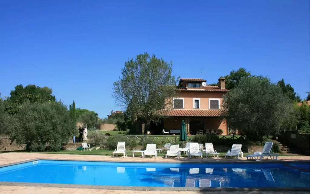 You will find Villa Iris in a panoramic position in southern Tuscia, only 60 km from Rome. The villa overlooks green hills covered with hazelnut trees, vineyards and olive groves and is situated on a plateau 292 metres above sea level near the WWF OASI of Corchiano.