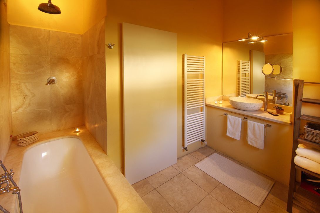 On the first floor there is a large open plan dining room with a sofa, fire place, a table for 8 and a spacious kitchen, all this underneath a beautiful wooden beam ceiling. Behind an artistic painted door there is a double bedroom and a private bathroom with bathtub in travertine.