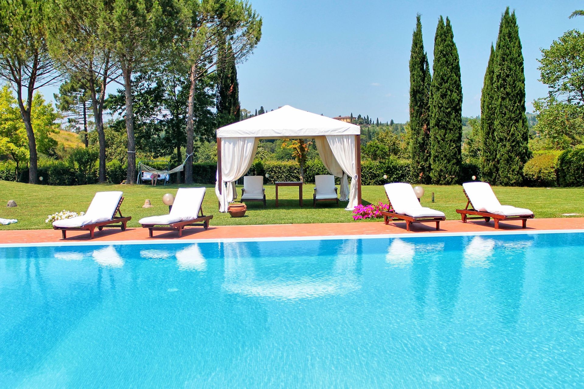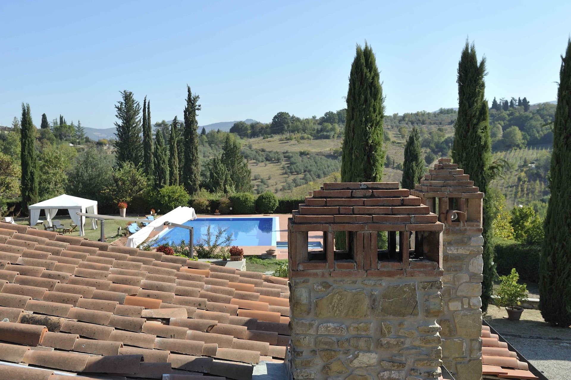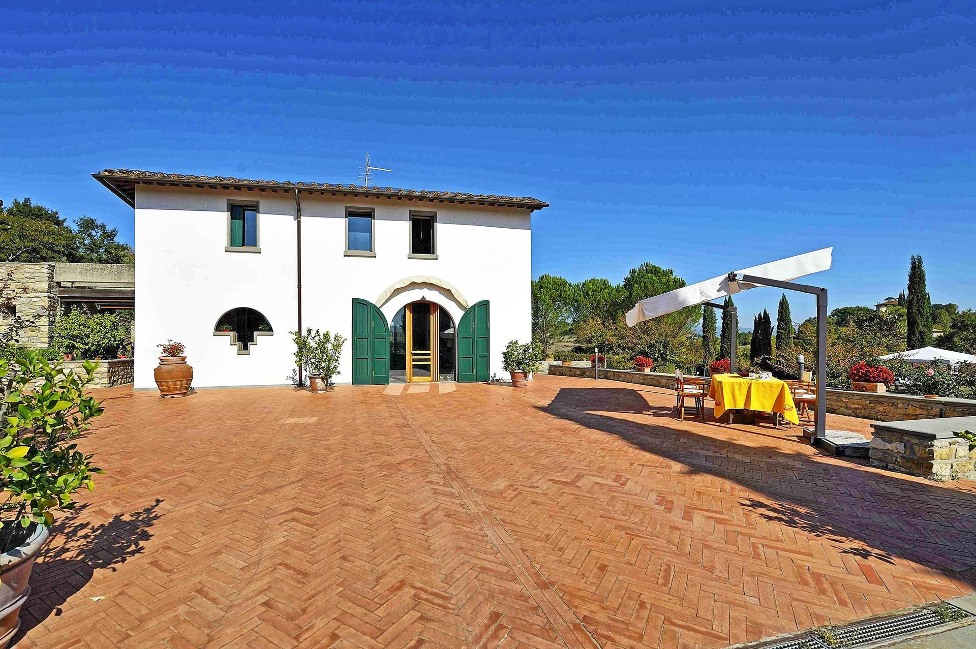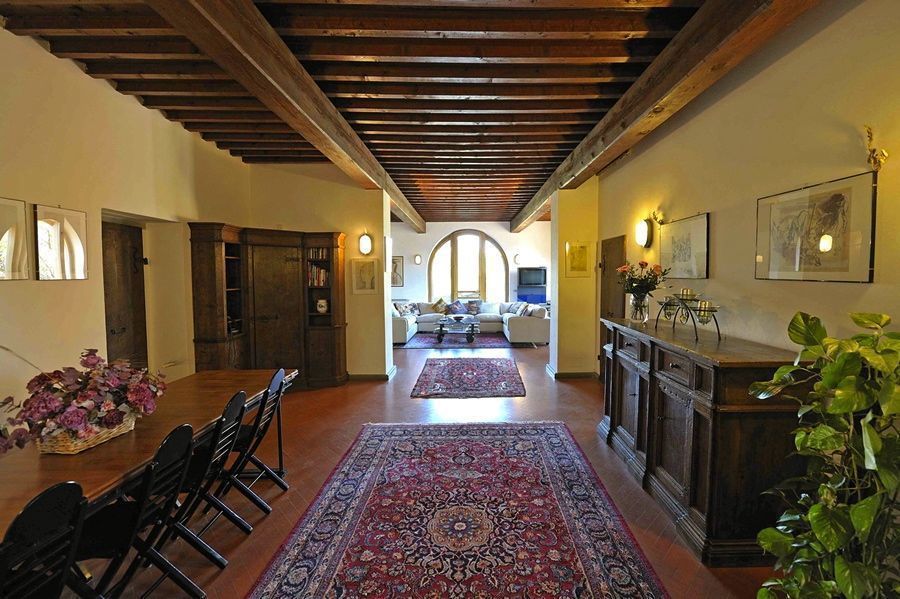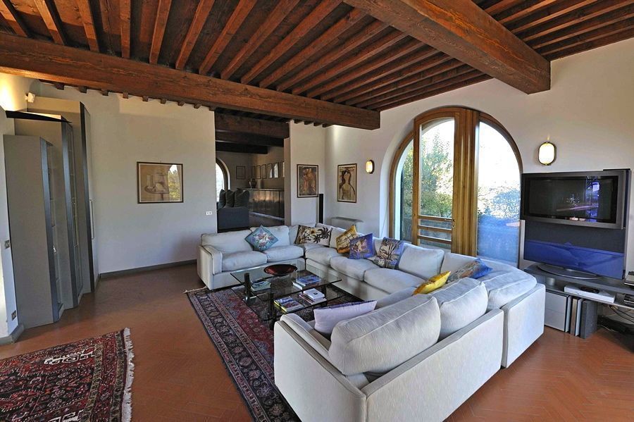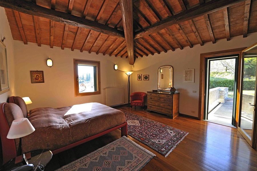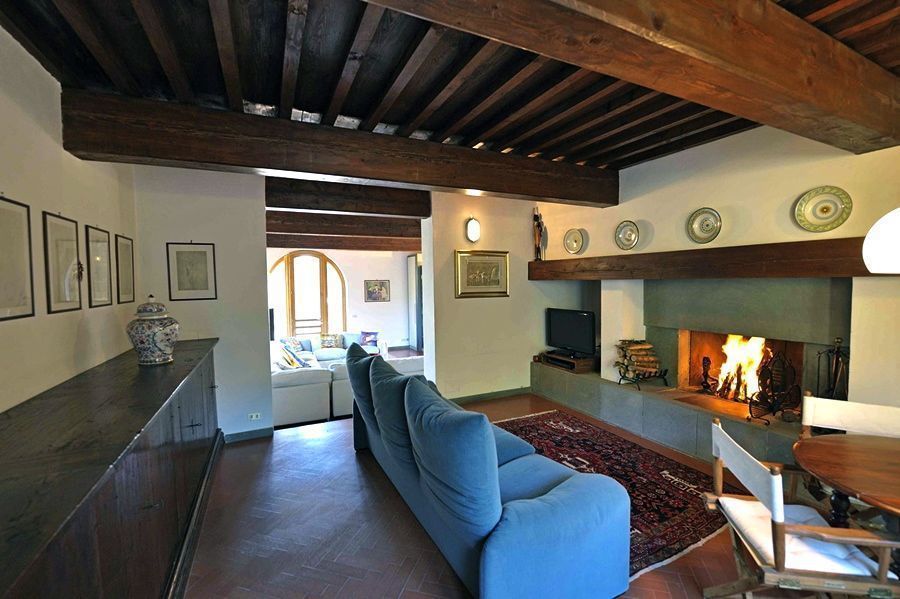 Ancient and welcoming restored farmhouse situated in panoramic location, only 7 km from Florence. This villa, surrounded by beautiful olive groves, vineyards, peach, cherry and apricot-trees, offer a large, well-kept terraced garden with private pool, Jacuzzi tub and tennis court. Outside, guests can also enjoy use or a charming restored barn with kitchen, bread oven, barbecue and dining area ideal for al-fresco dining.
