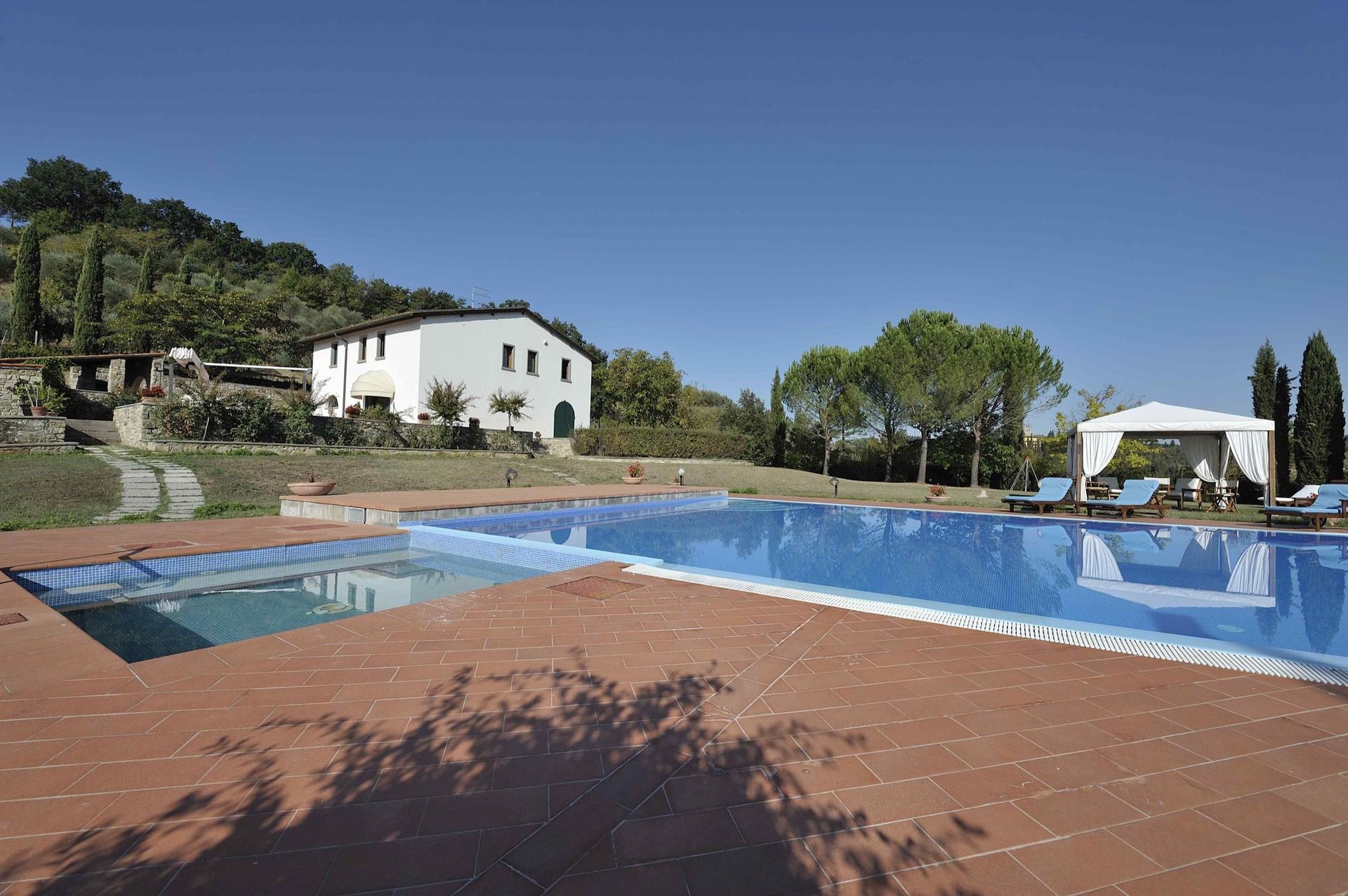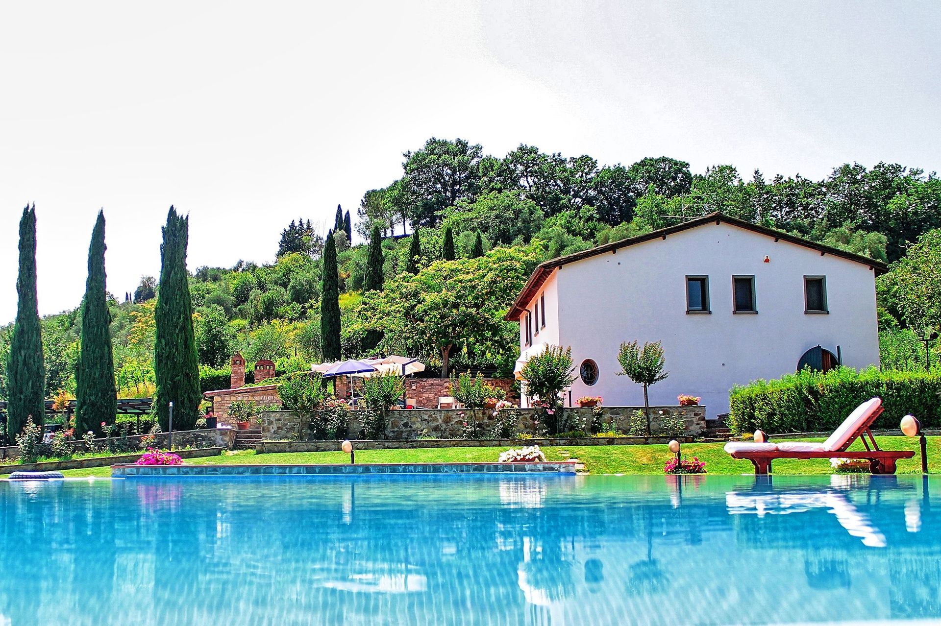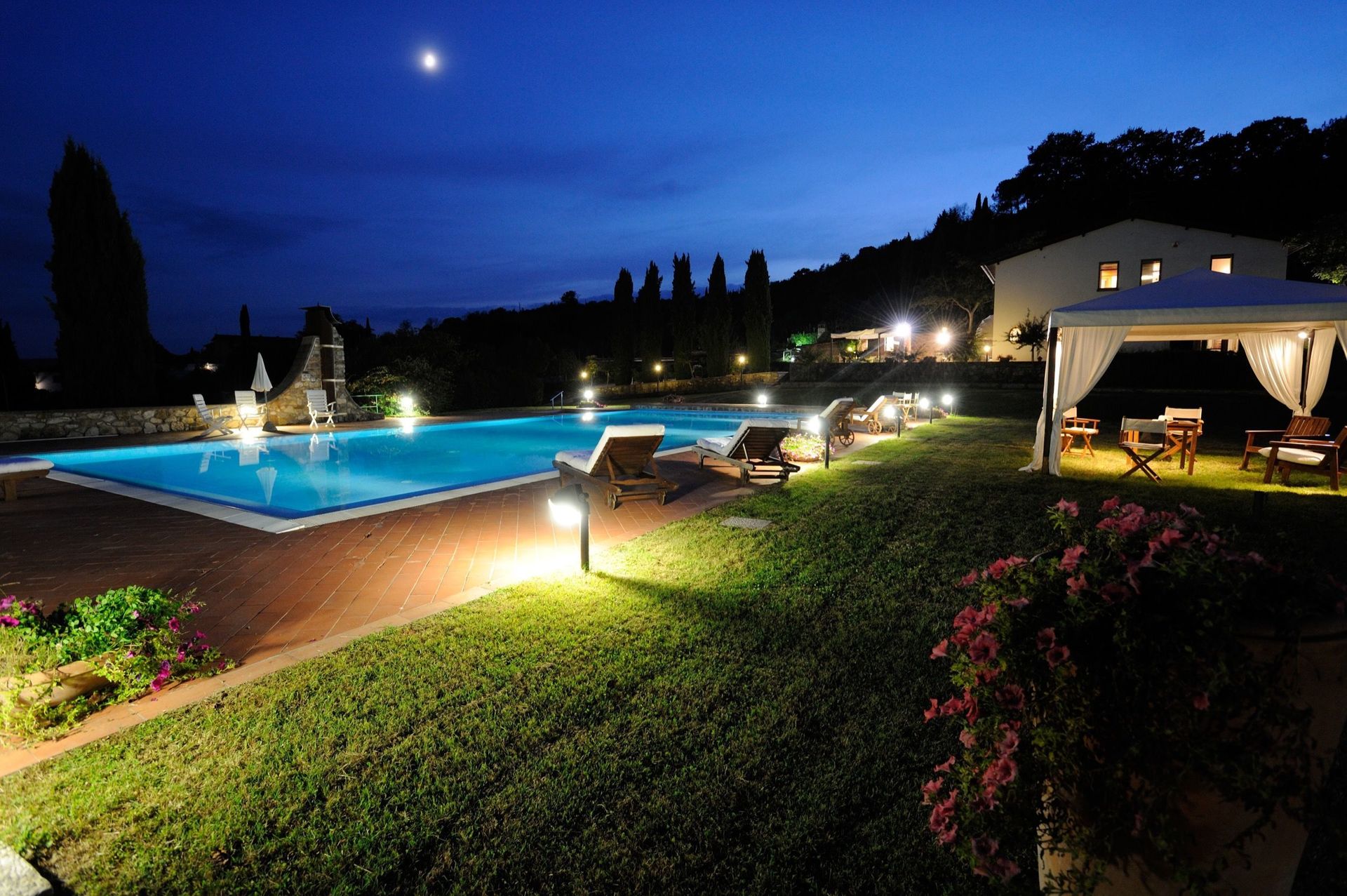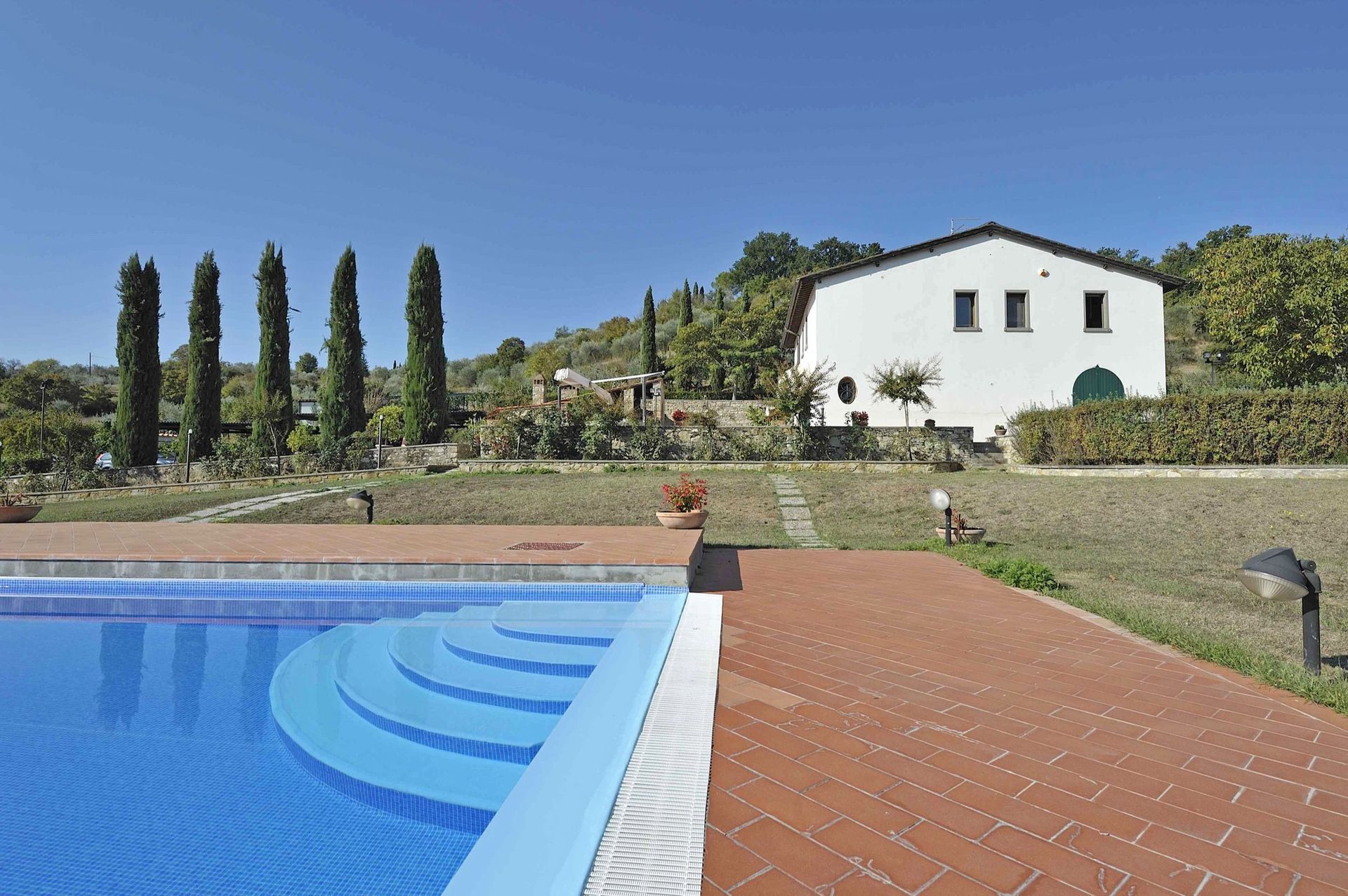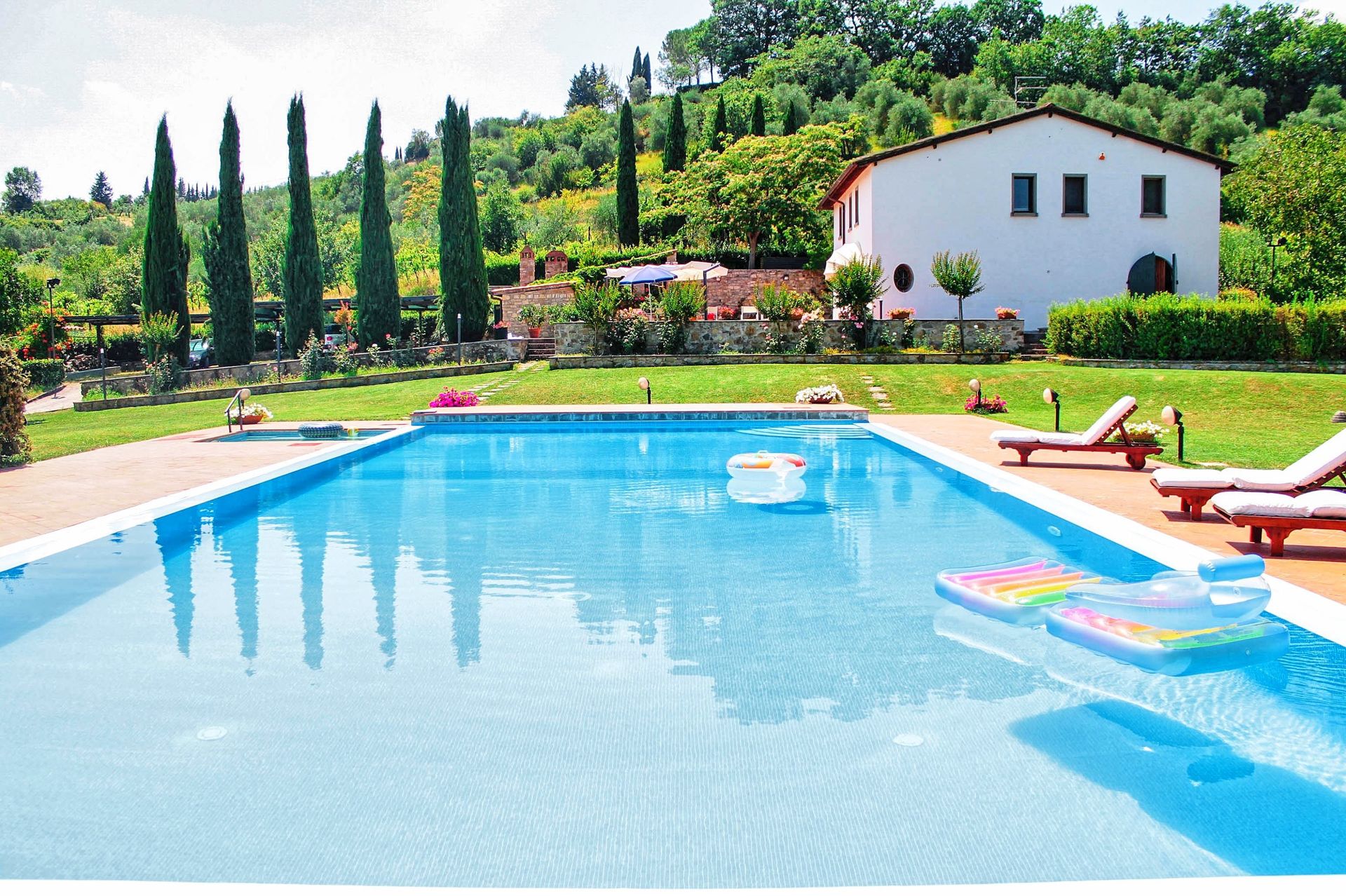 Ancient and welcoming restored farmhouse situated in panoramic location, only 7 km from Florence. This villa, surrounded by beautiful olive groves, vineyards, peach, cherry and apricot-trees, offer a large, well-kept terraced garden with private pool, Jacuzzi tub and tennis court. Outside, guests can also enjoy use or a charming restored barn with kitchen, bread oven, barbecue and dining area ideal for al-fresco dining.