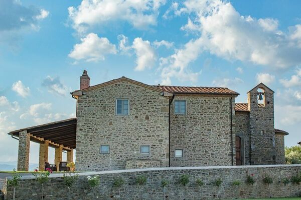 Beautiful, recently restored villa situated on a hill top overlooking the city of Arezzo and the Chiana valley. This property is entirely fenced in and comprises the owners’ house and a charming small church dating back to the 7th century. Outside guests can enjoy use of a large, well-groomed garden with a beautiful, private swimming-pool set in panoramic location. The villa was divided into 4 apartments which are connected internally and are rentable only together as a private accommodation. The interiors are welcoming and tastefully furnished. On the ground floor there is a large, furnished portico ideal for al-fresco dining.