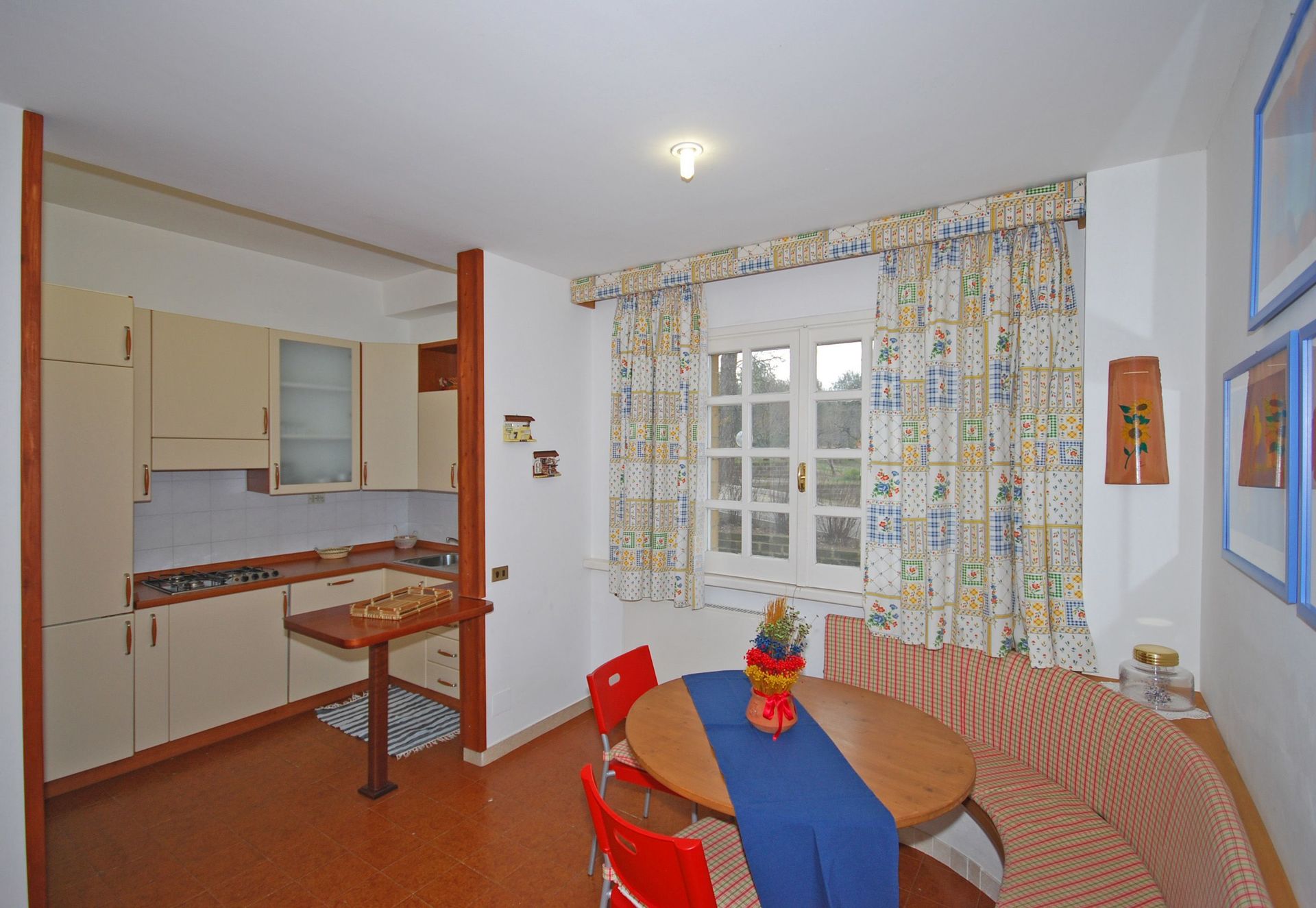 Ground floor: dining area with kitchen corner (freezer, dishwasher), double bedroom, bedroom with 2 single beds, bathroom with bathtub. An additional single bed can be added free of charge (to sleep a 5th person).