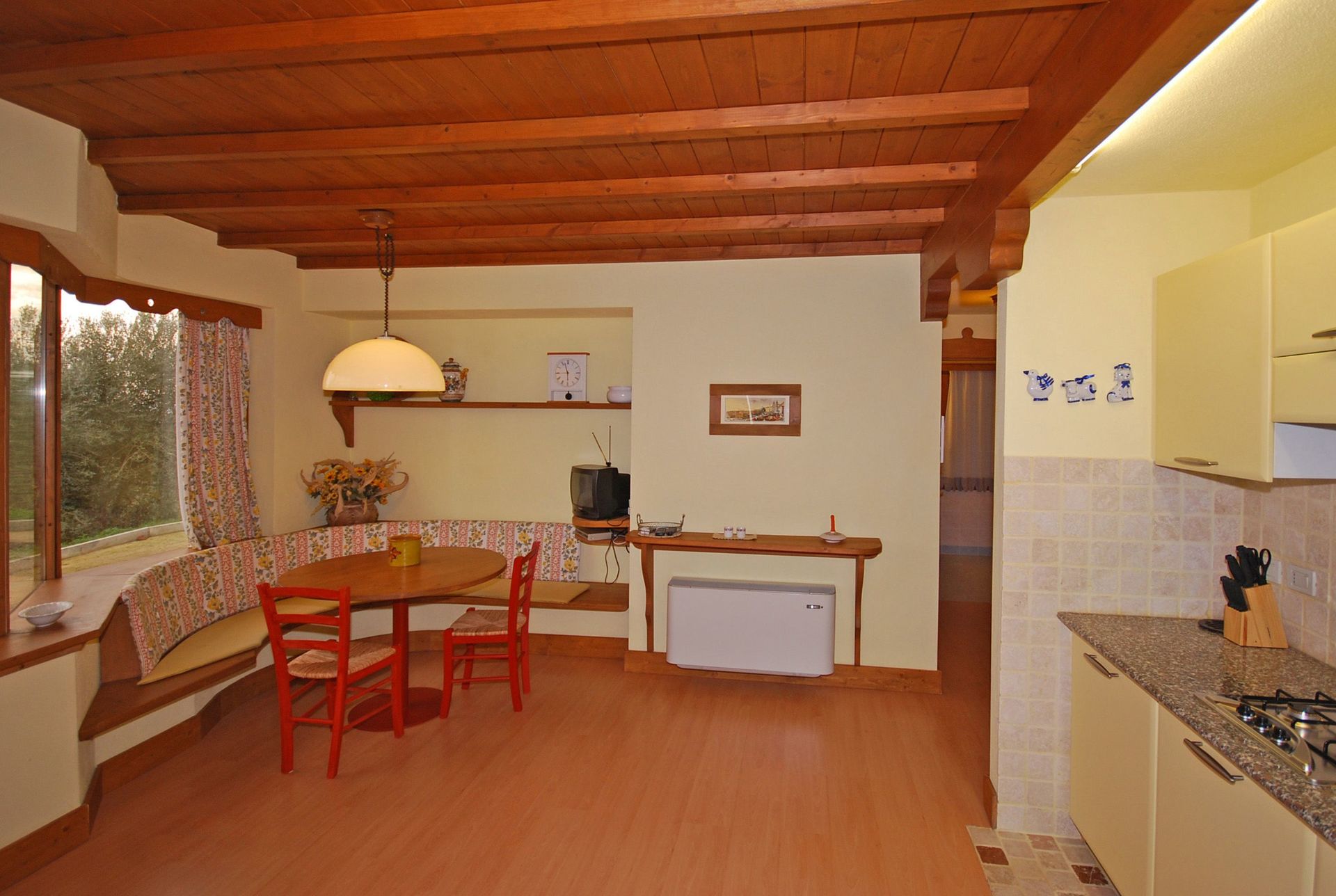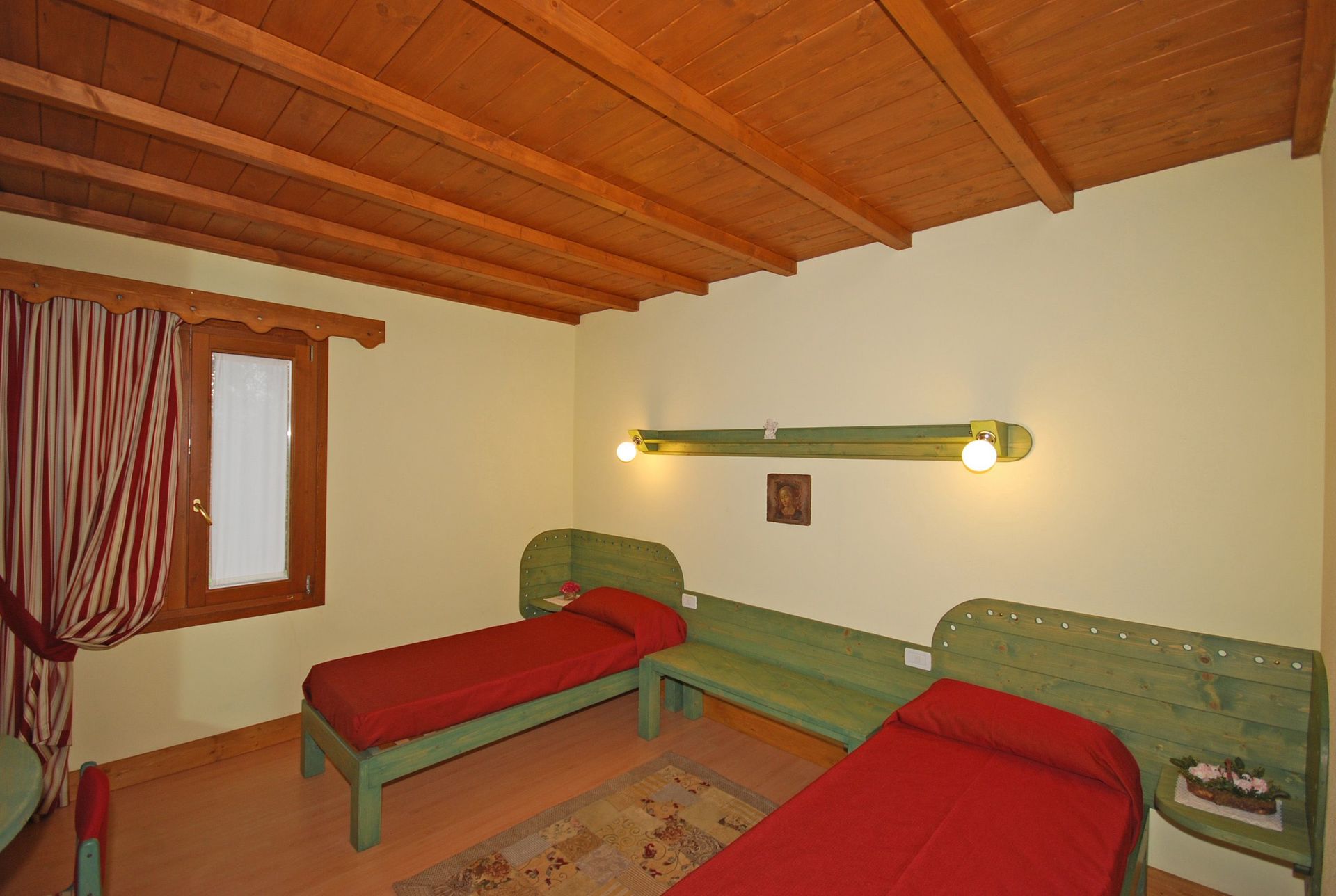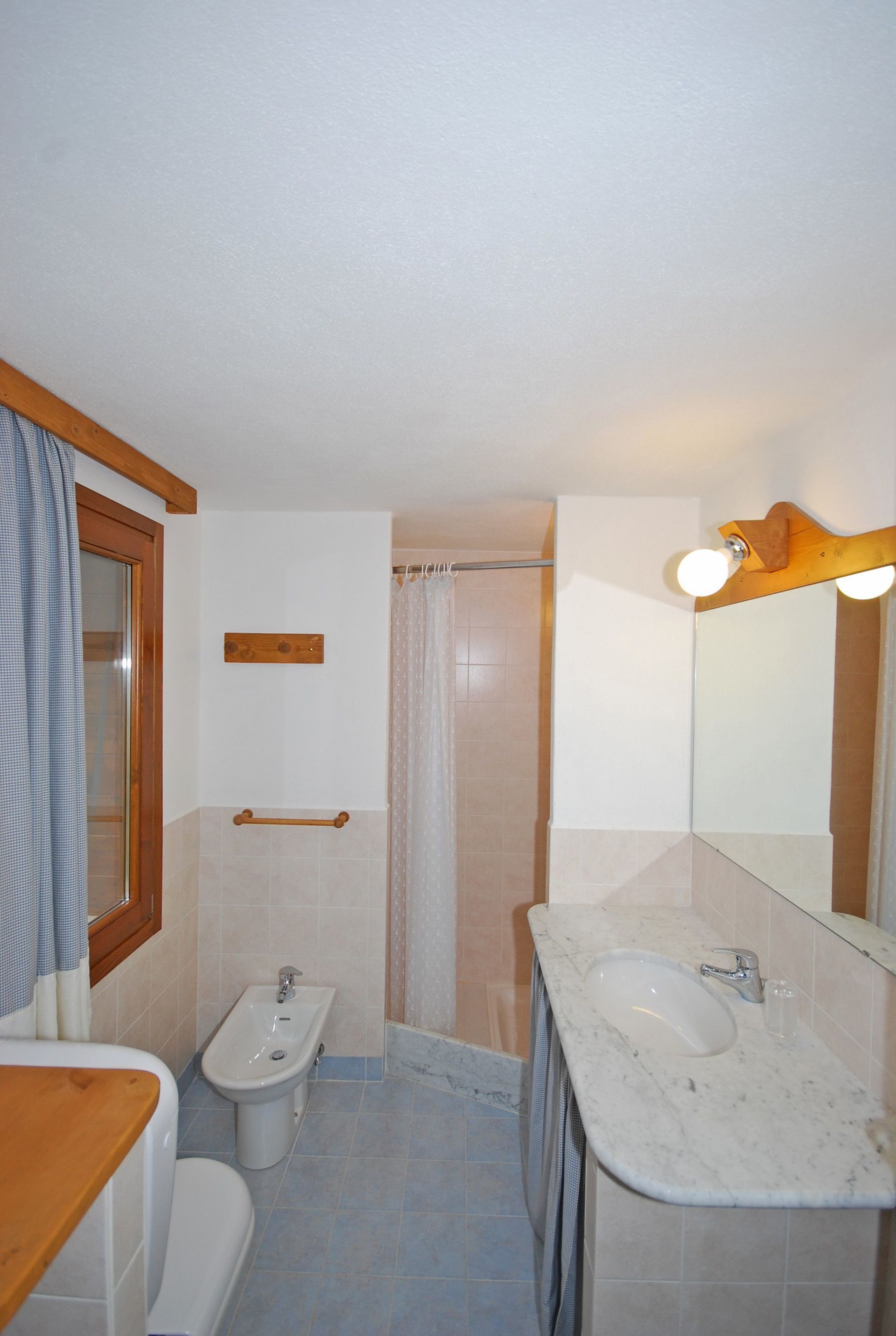 Ground floor: dining area with kitchen corner (microwave), double bedroom with private bathroom with shower, bedroom with 2 single beds, bathroom with shower. An additional single bed can be added free of charge (to sleep a 5th person).