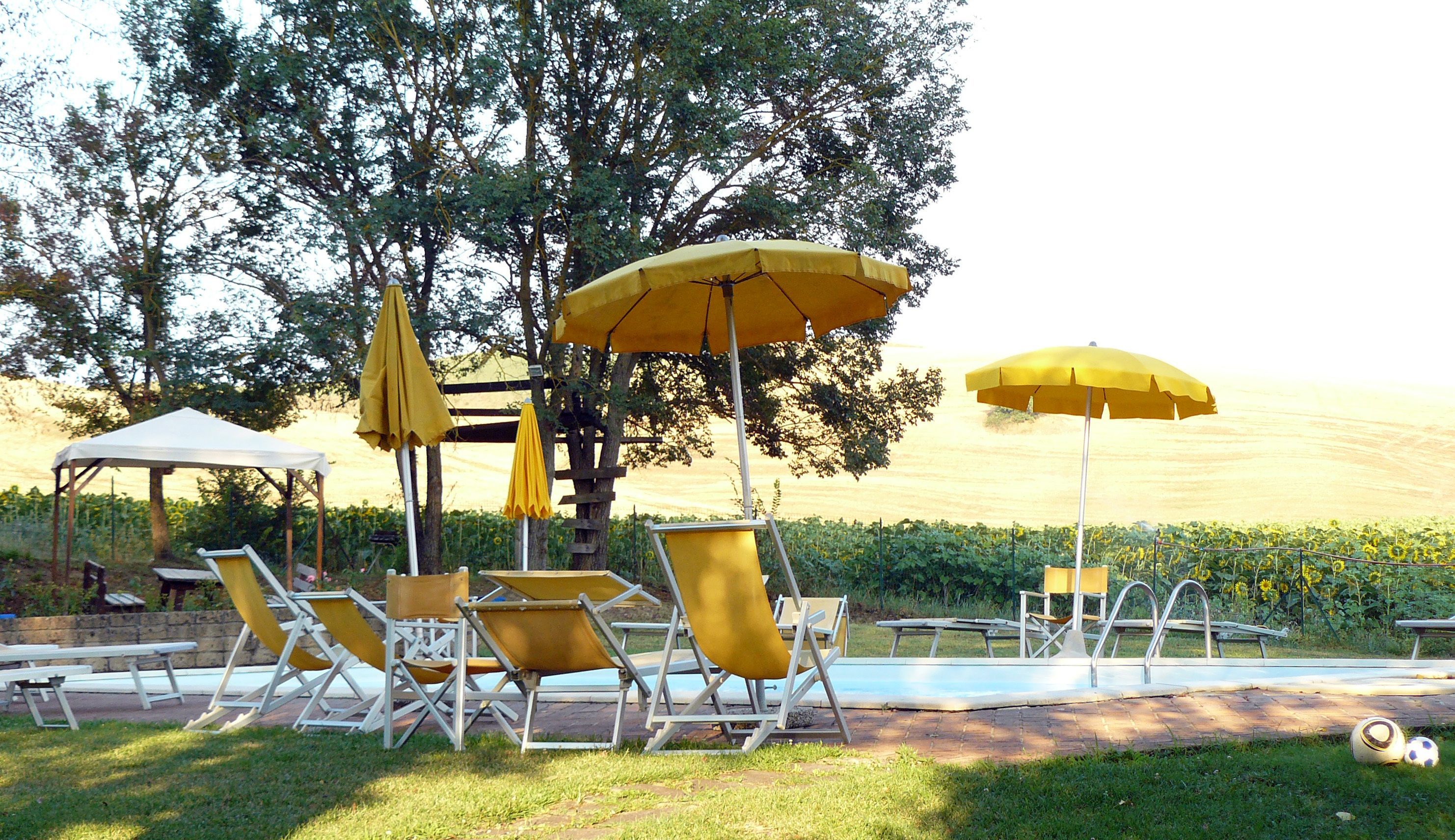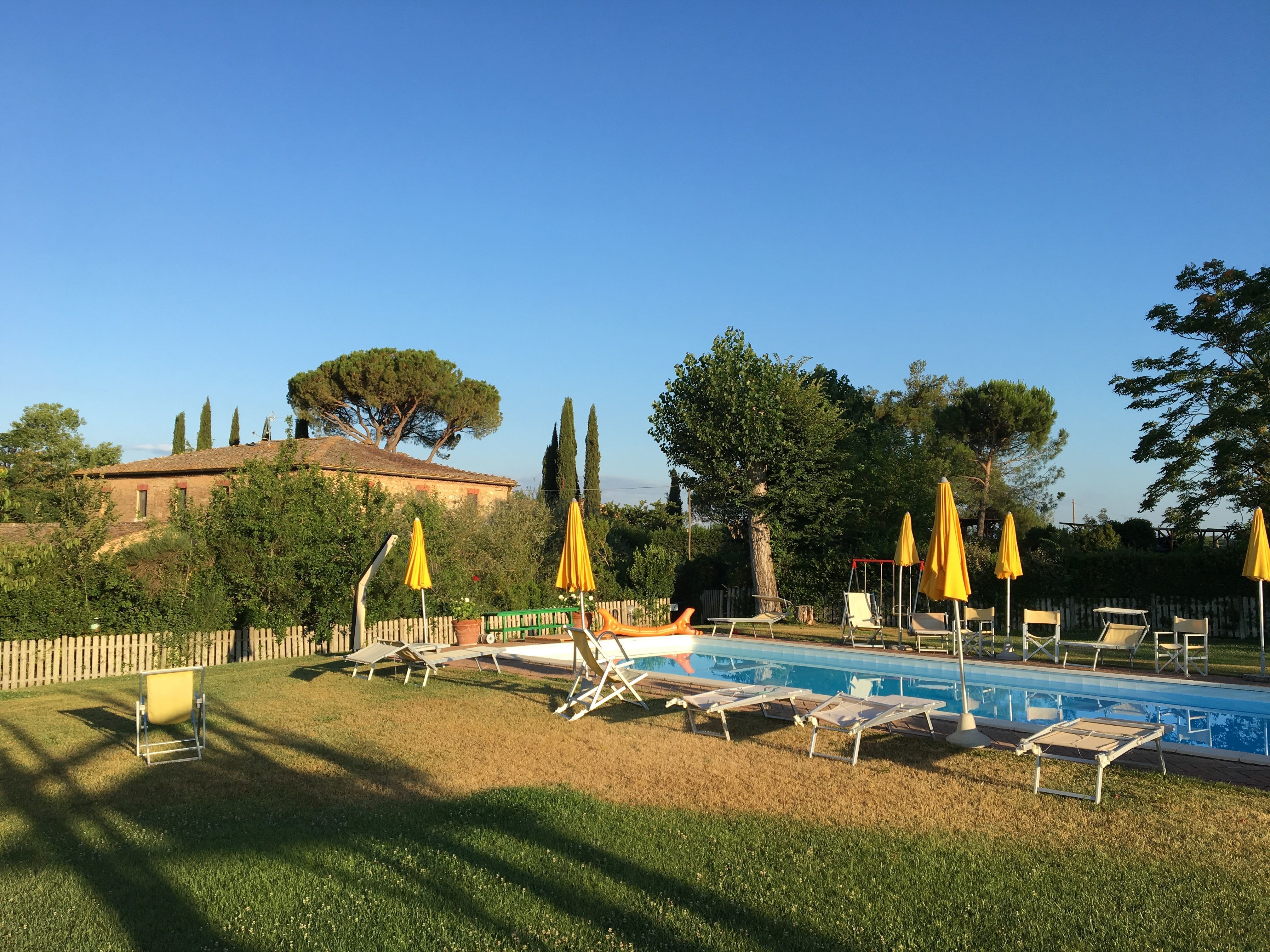 After arriving you will be greeted by the owner or manager where you’ll find a lovely clean well-maintained property with views of the hills ideal for a splendid holiday in Tuscany. For your pleasure you will find a private pool where you can relax while enjoying a nice cold beverage after a hectic day of shopping. For your pleasure, on the grounds there is a patio, playground and barbecue grill. Sharing a meal with friends and family is a big part of the Tuscan culture. Take advantage of the well-equipped kitchen to prepare meals using local produce while on your holiday. The kitchen includes coffee machine, microwave, toaster, stove and refrigerator, as well as, plenty of tableware and cutlery for up to 18 people. Dine 'al fresco' like a real Tuscan, the fully furnished balcony is the perfect setting to enjoy food, family and the beautiful Tuscan weather.